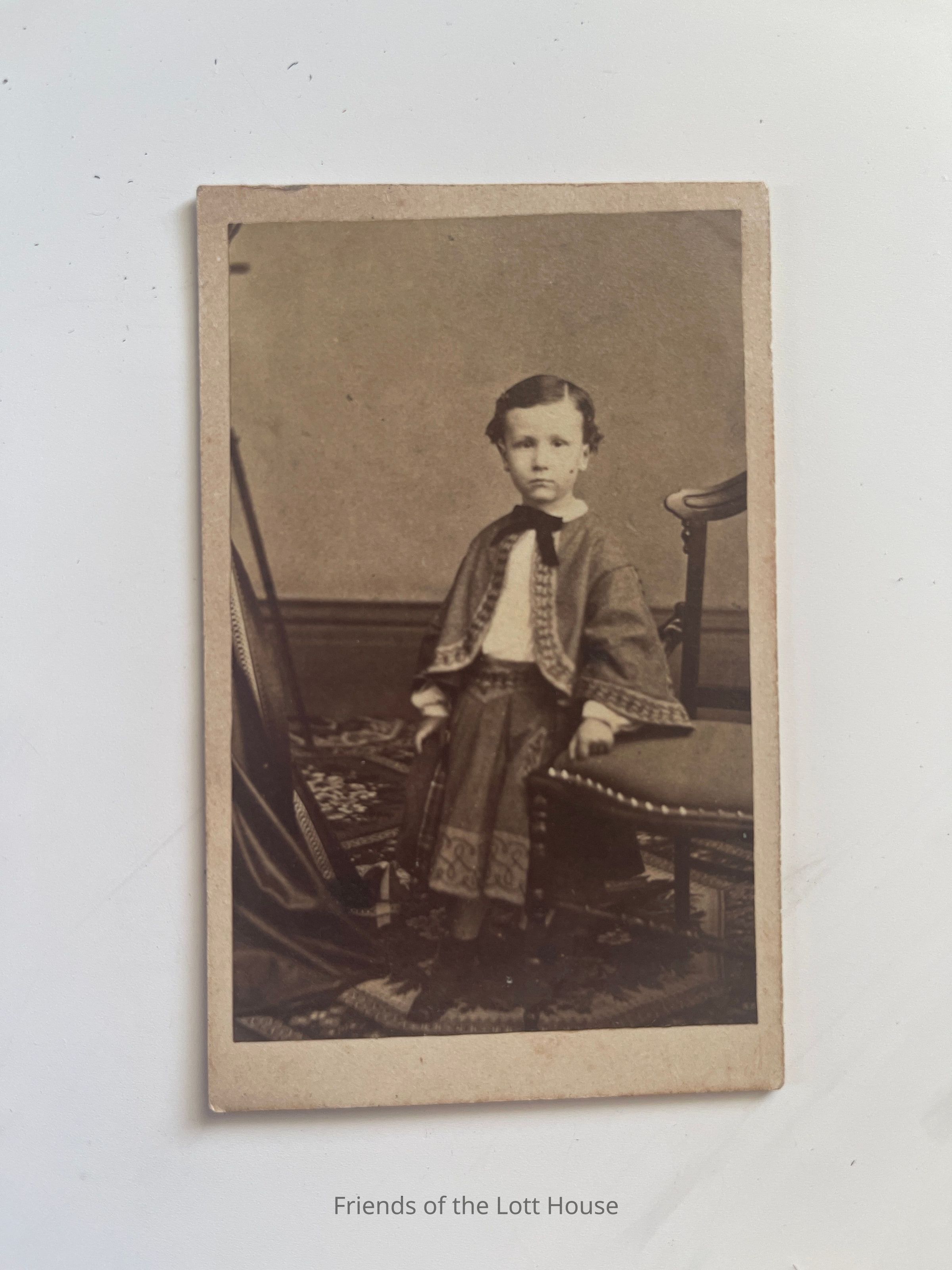 Photograph of small boy sitting for professional photograph. Freddy Randall child of James and Anna R. he was Nellie's Age.Collection
