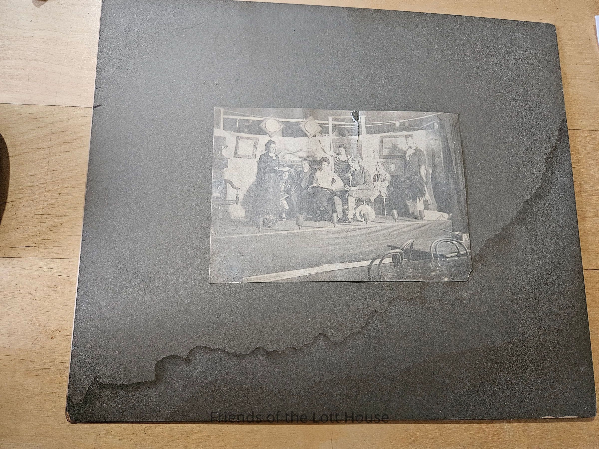 Photograph of people on a stage in the midst of what appears to be a play. Water damagedCollection