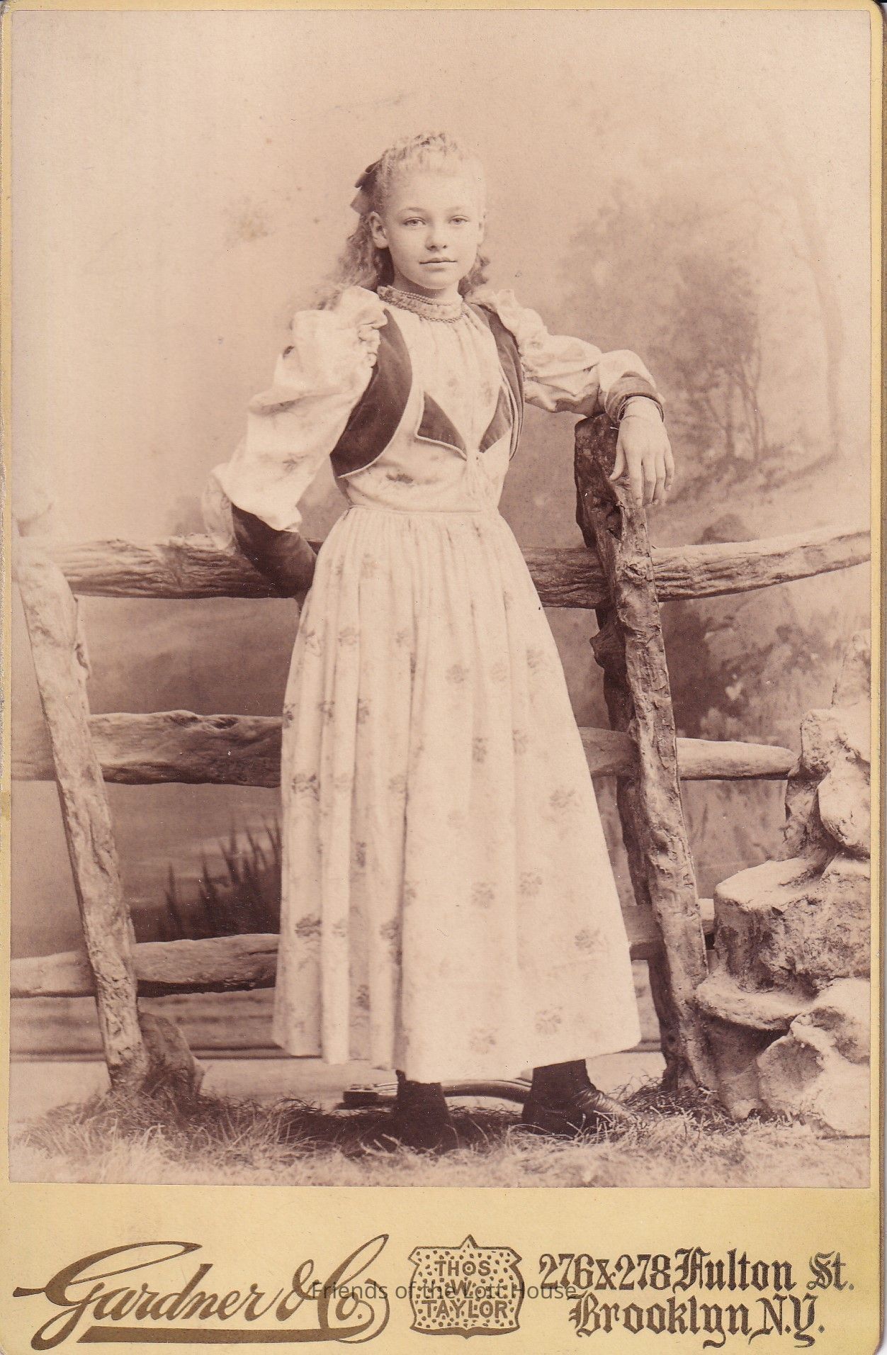 Photo of a girl standing and leaning on a fence while wearing a dress. Jennie Grace Ditmas. Has logo for photo company on front bottom and the backCollection