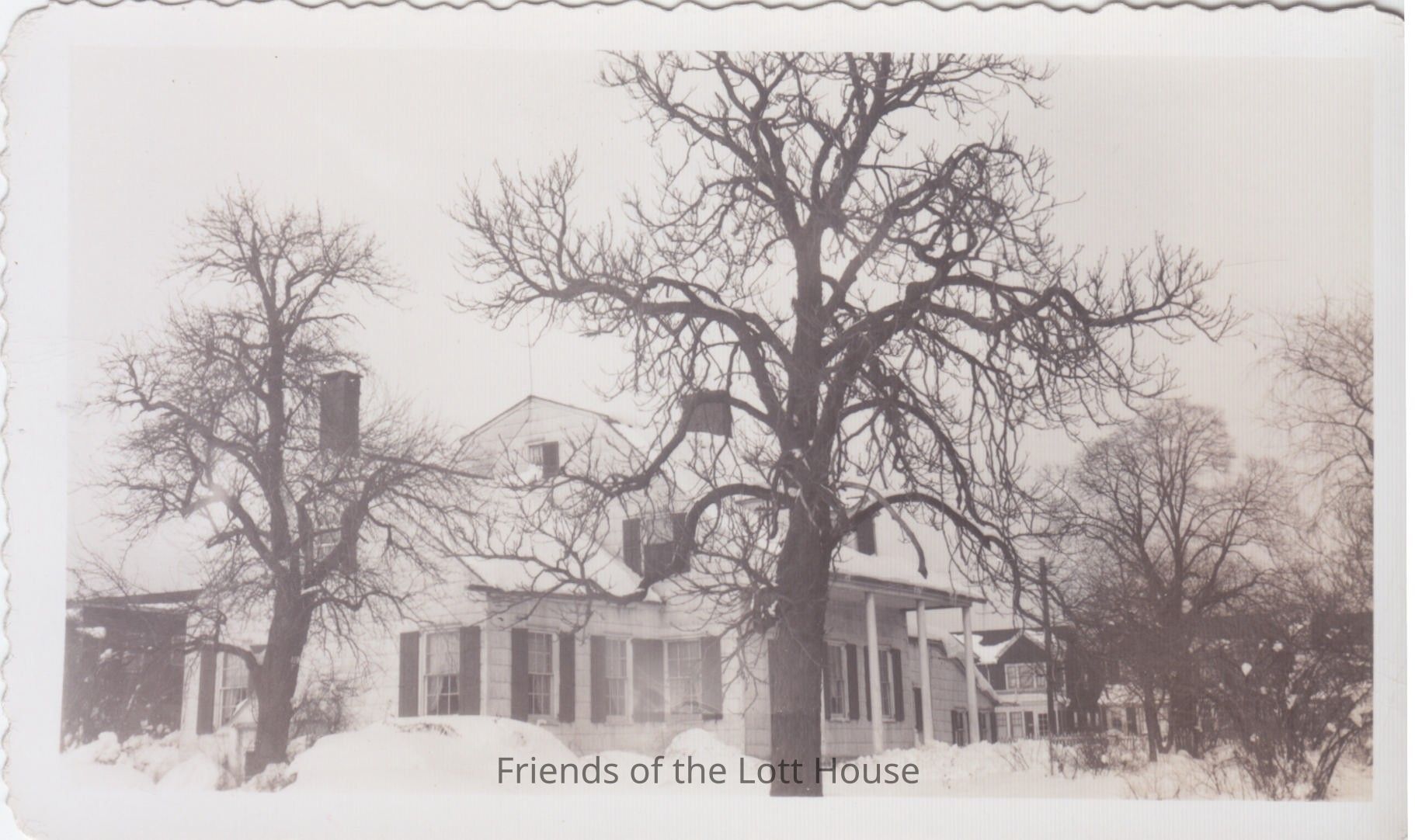 Lott House in snow, two trees in foreground. 1940sPhotograph Details