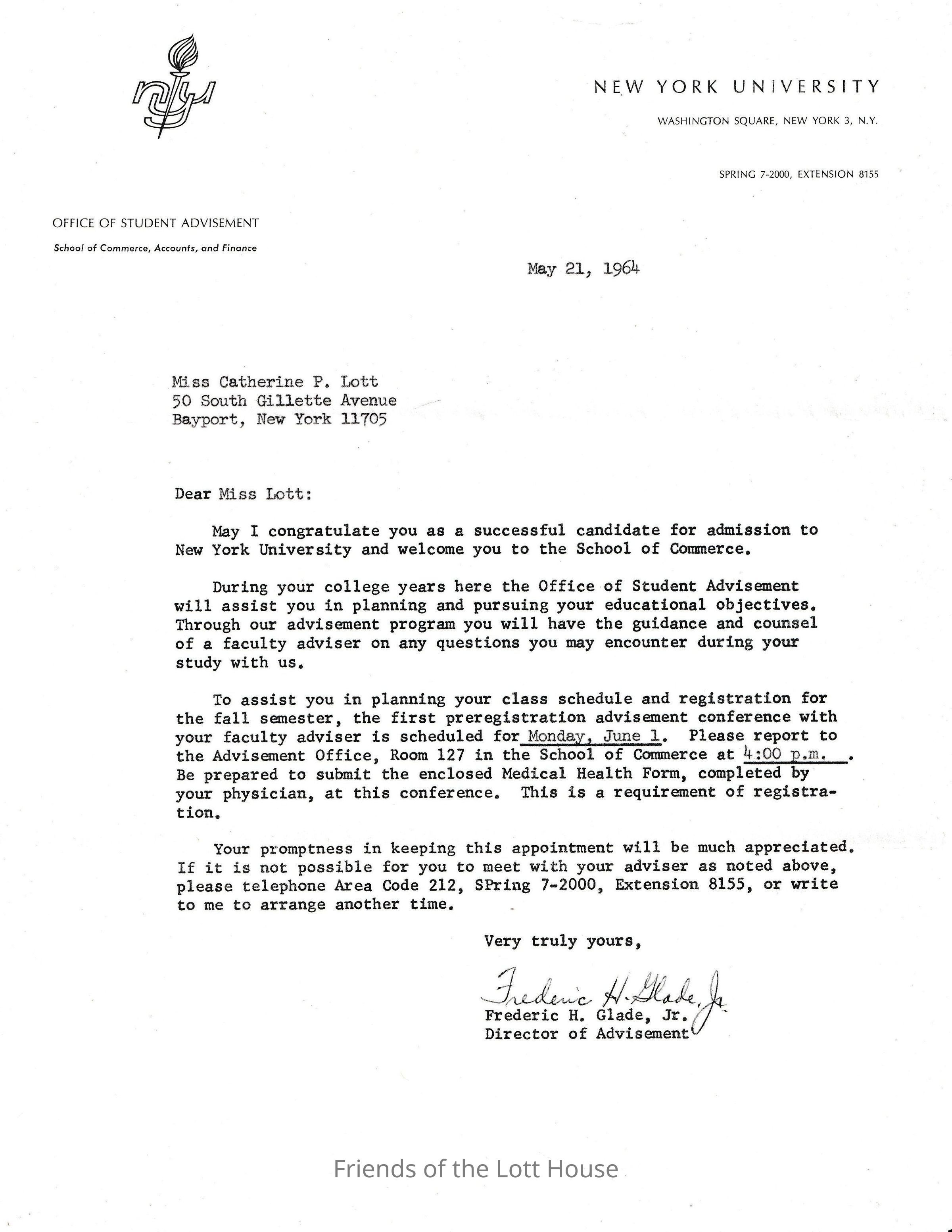 Catherine P. Lott Admissions letter NYU School of Commerce, May 21, 1964Collection