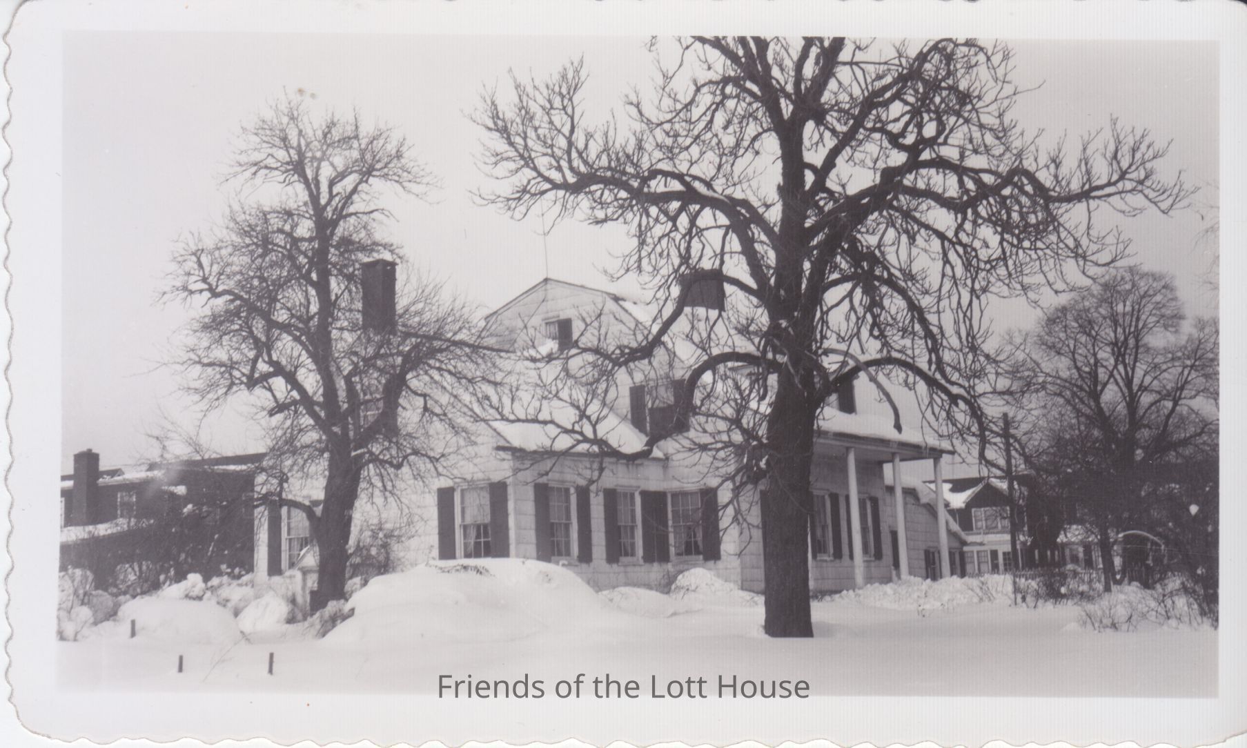 Lott House in snow, two trees in foreground. 1940sPhotograph Details