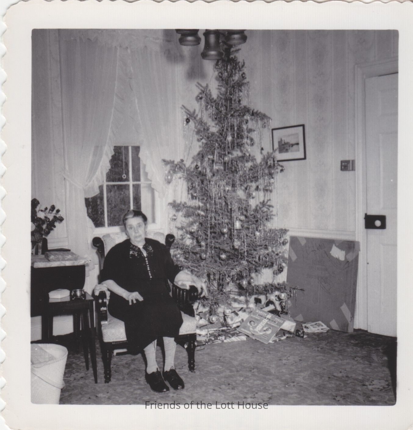 Jennie M. Lott Suydam sitting by Christmas tree in East Parlor, December 1949Photograph Details