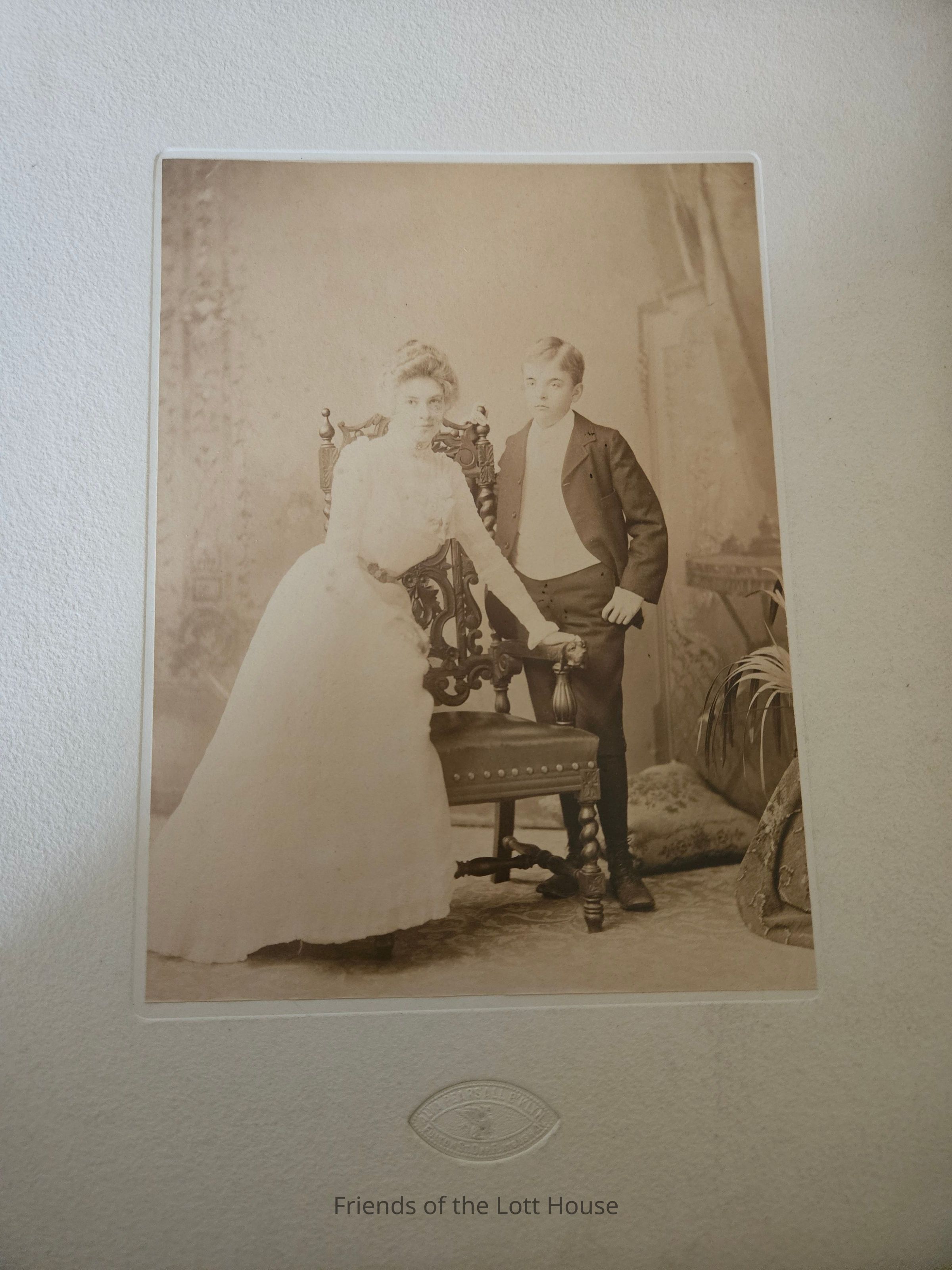 Photograph of a young man and young woman in formal wear and by a chair.Collection