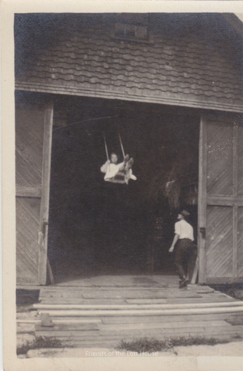 Ella Suydam and John Voorhees Lott on barn door swing. Pre-1925Photograph Details