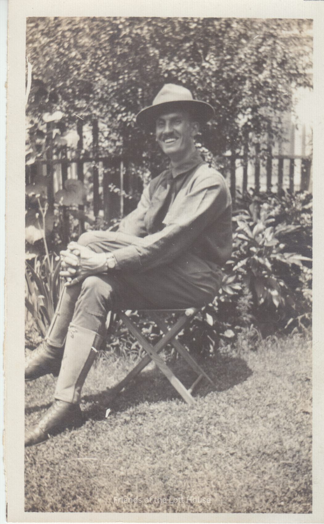 Grant Price in uniform sitting in chair by fence.Photograph Details