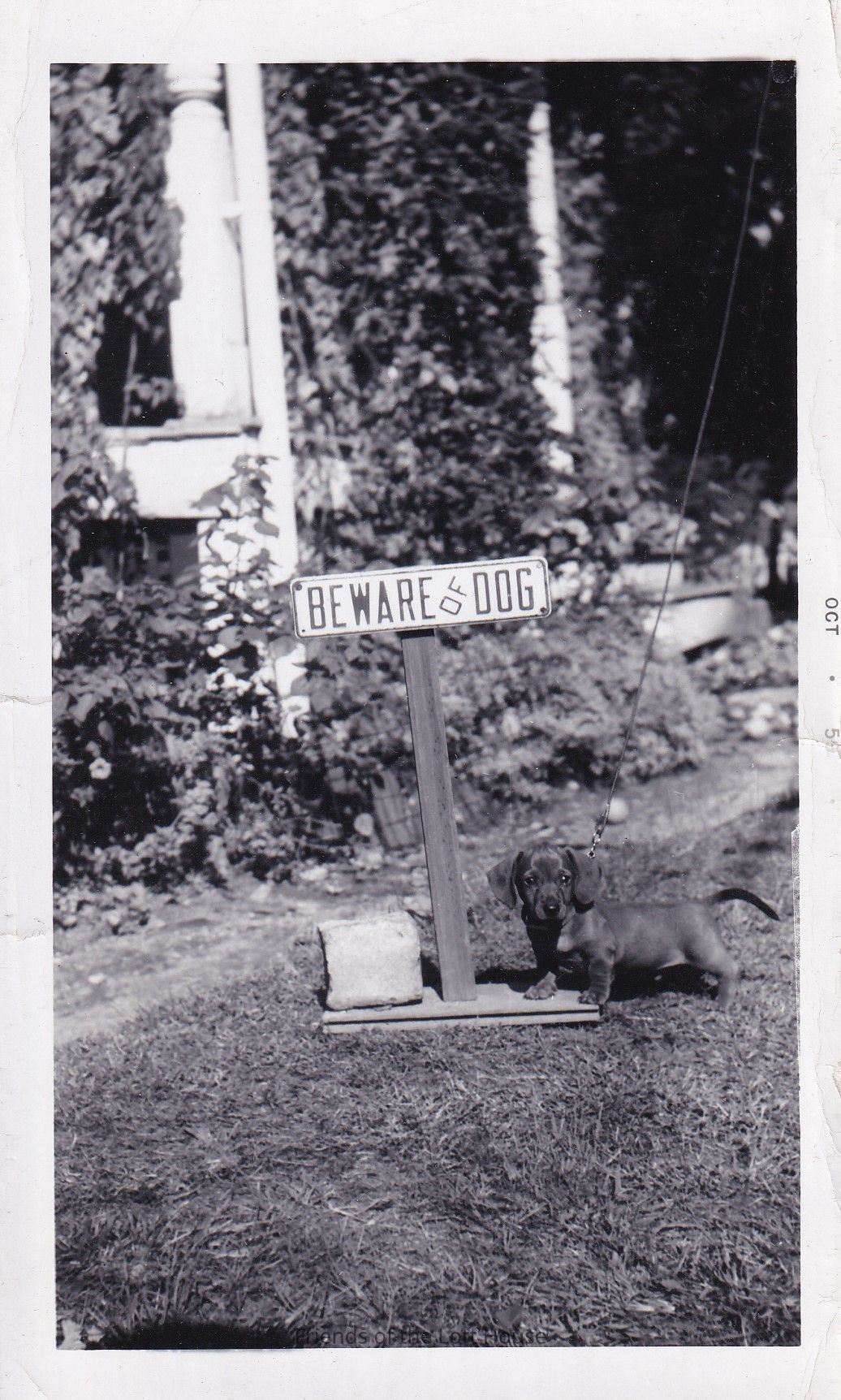 Photo of dog next to "Beware of Dog" sign. Back says dog is 7 weeks old and its 1959Collection