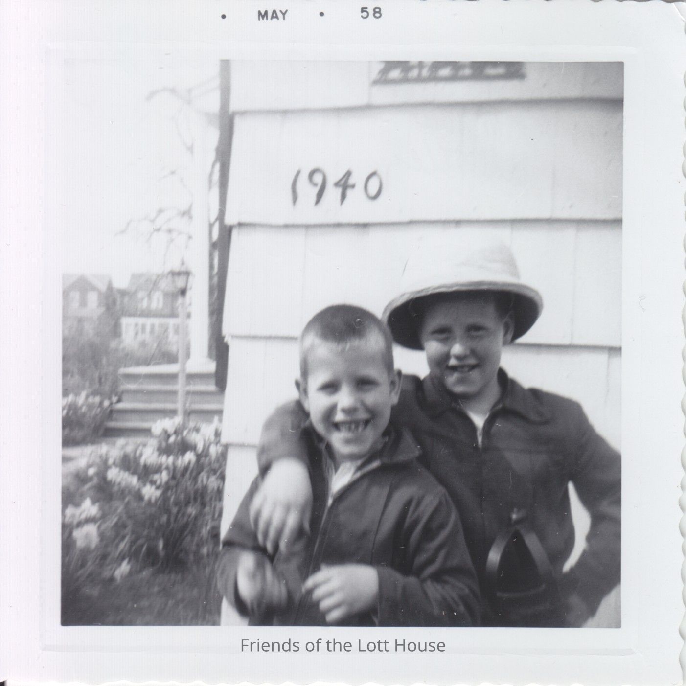 Byron Bristow Wooley and Andrew Suydam Wooley in front of the Lott House (by the house number). April 1958.Photograph Details