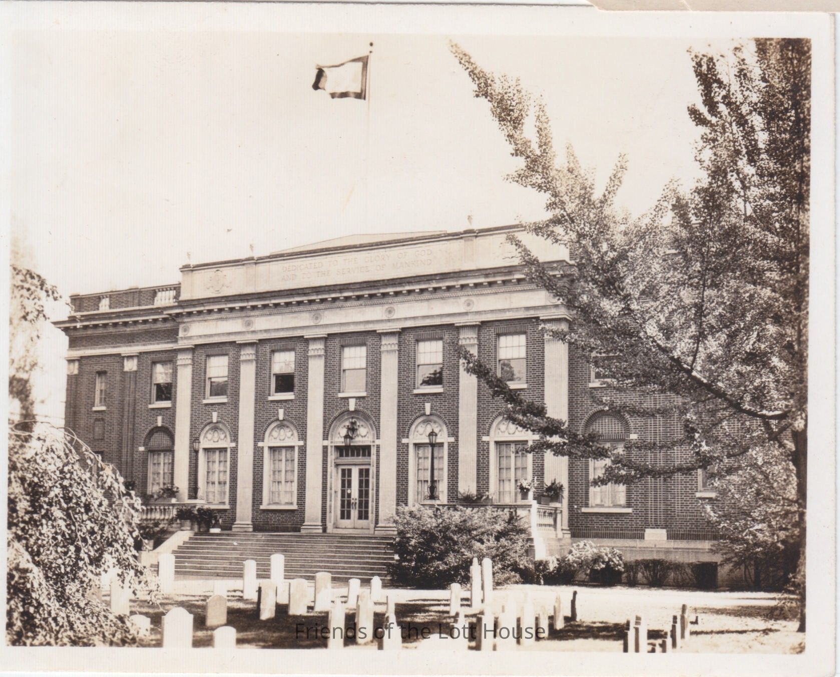Building with 'Dedicated to the glory of god and to the service of mankind' on it.Photograph Details