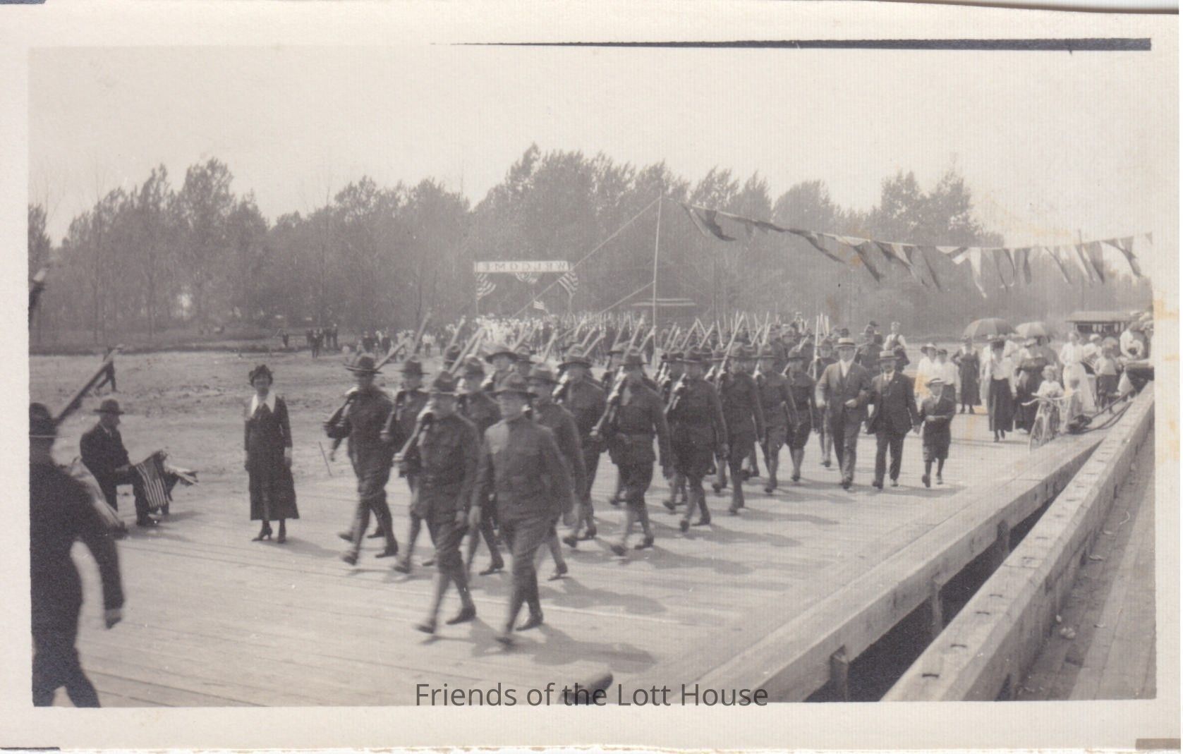 Military men, possibly army, walking down pier during parade.Photograph Details
