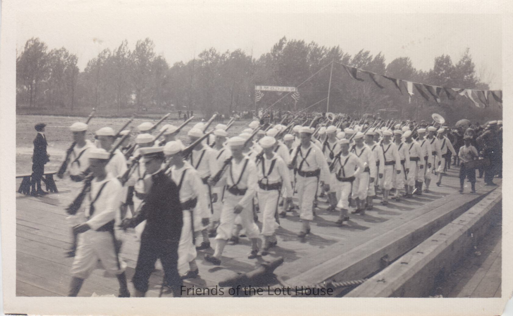 Military men, possibly navy, walking down pier during parade.Photograph Details