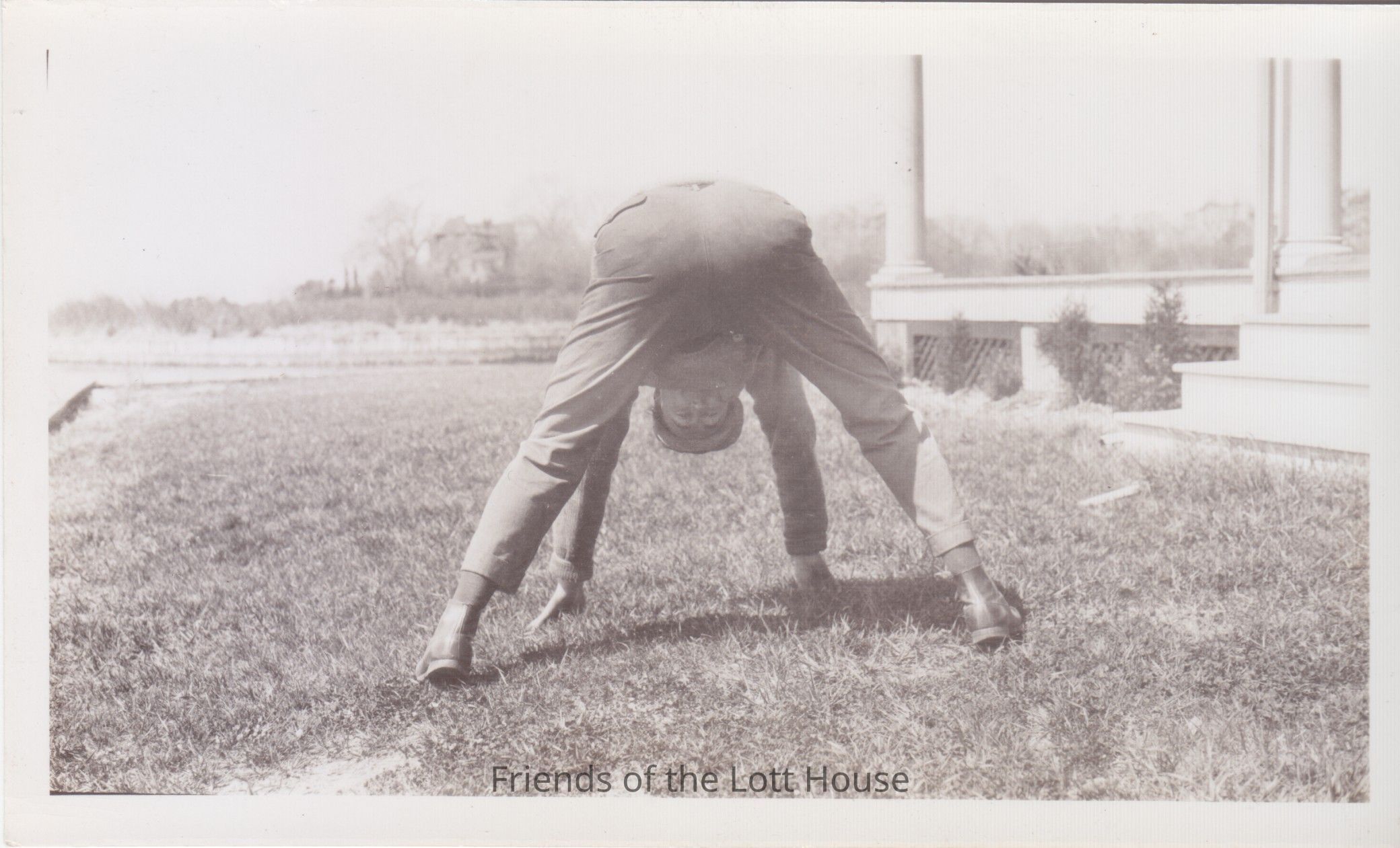 Man bending over, rear in air. Realty homes in distance. Post-1925Photograph Details