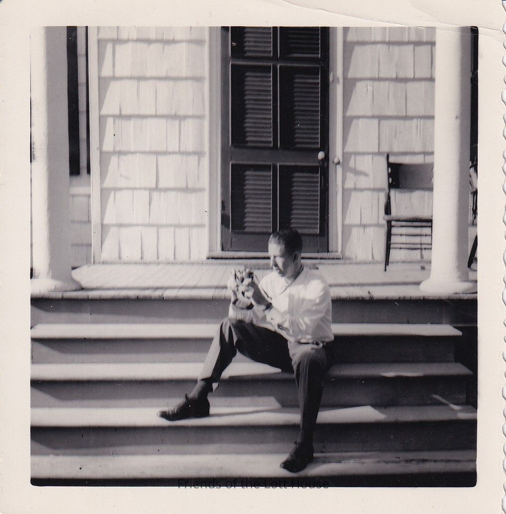 Bob Kluth sitting on Lott House porch steps with dogPhotograph Details