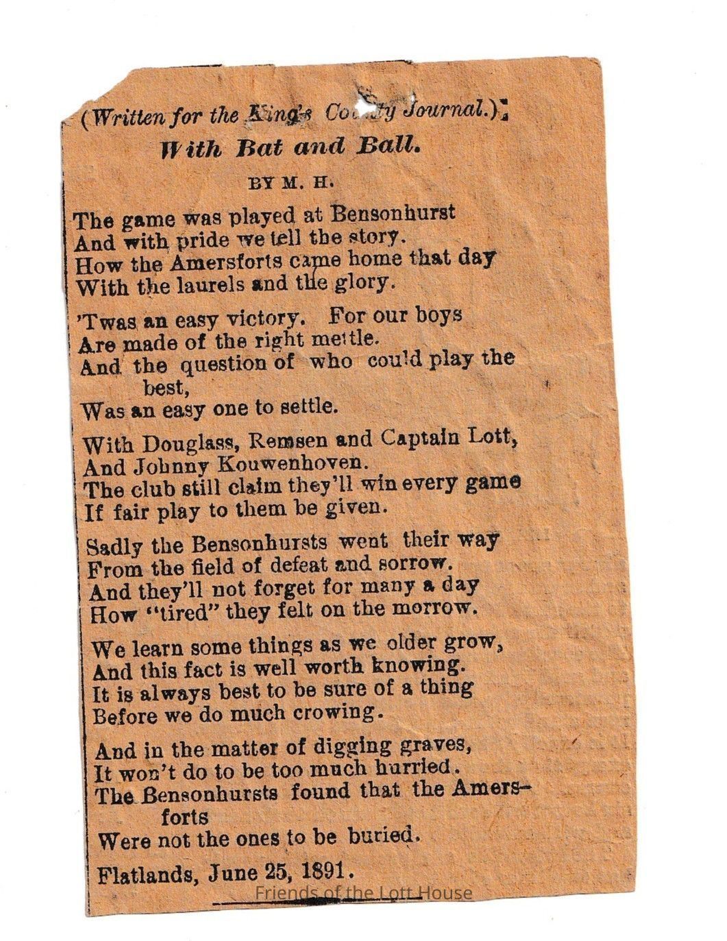 Baseball poem written for the Kings County Journal With Ball and Bat by M.H. Flatlands June 25, 1891Collection