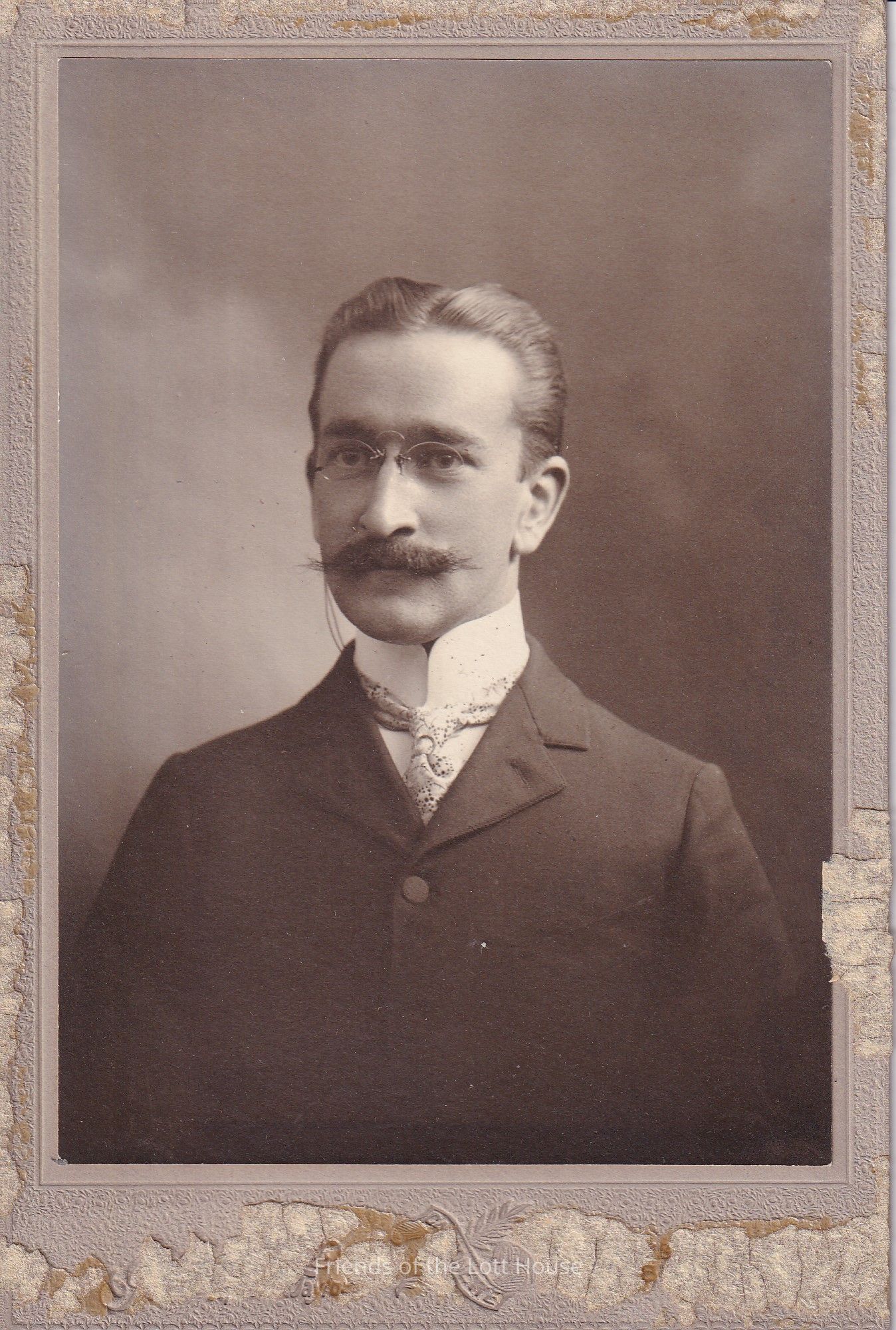 Photograph of a man in formal attire with mustache and glasses. Has "Frank Odell" written on backCollection
