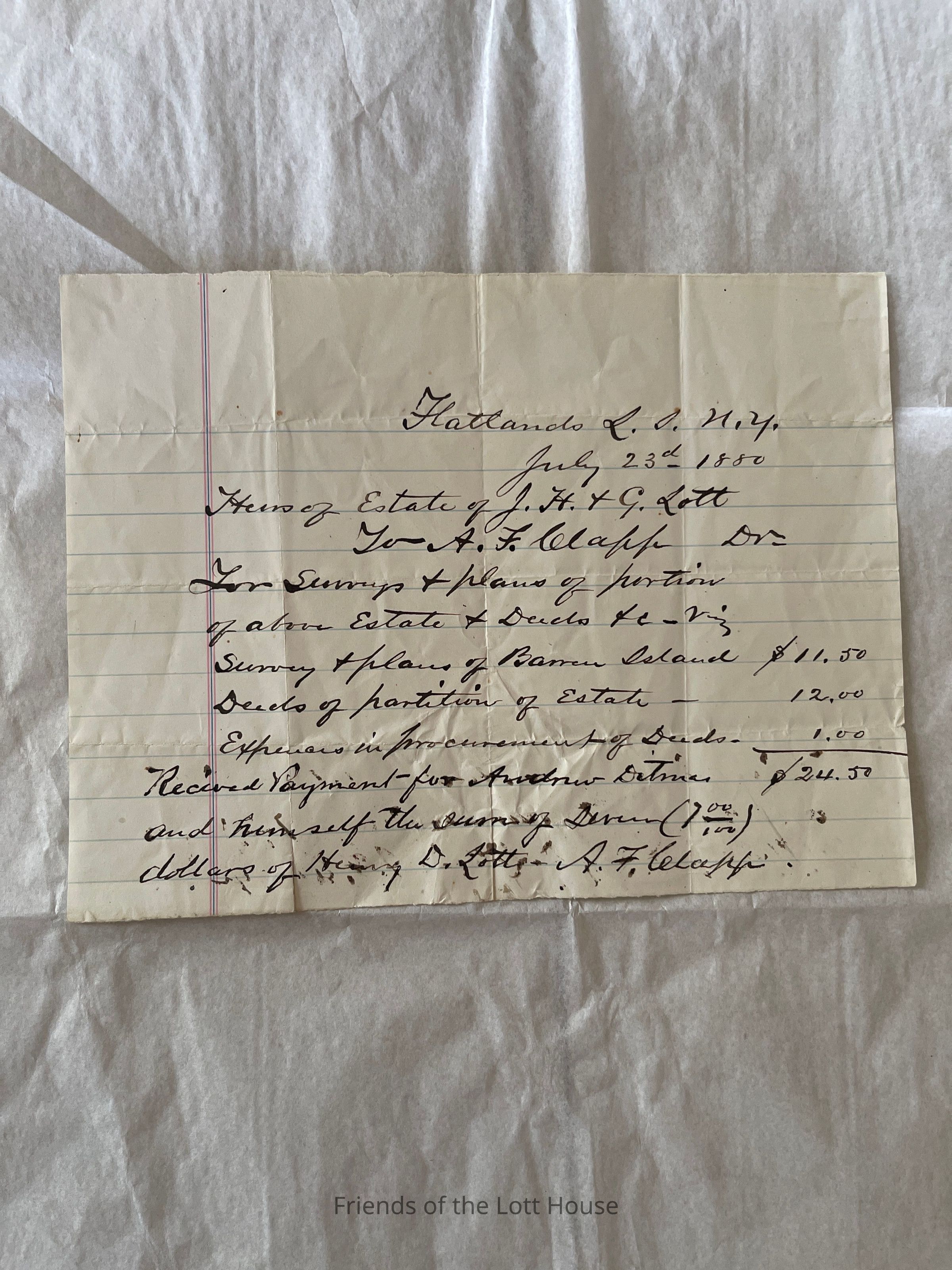 Receipt for Survey of estate for JH and G Lott July 23, 1880