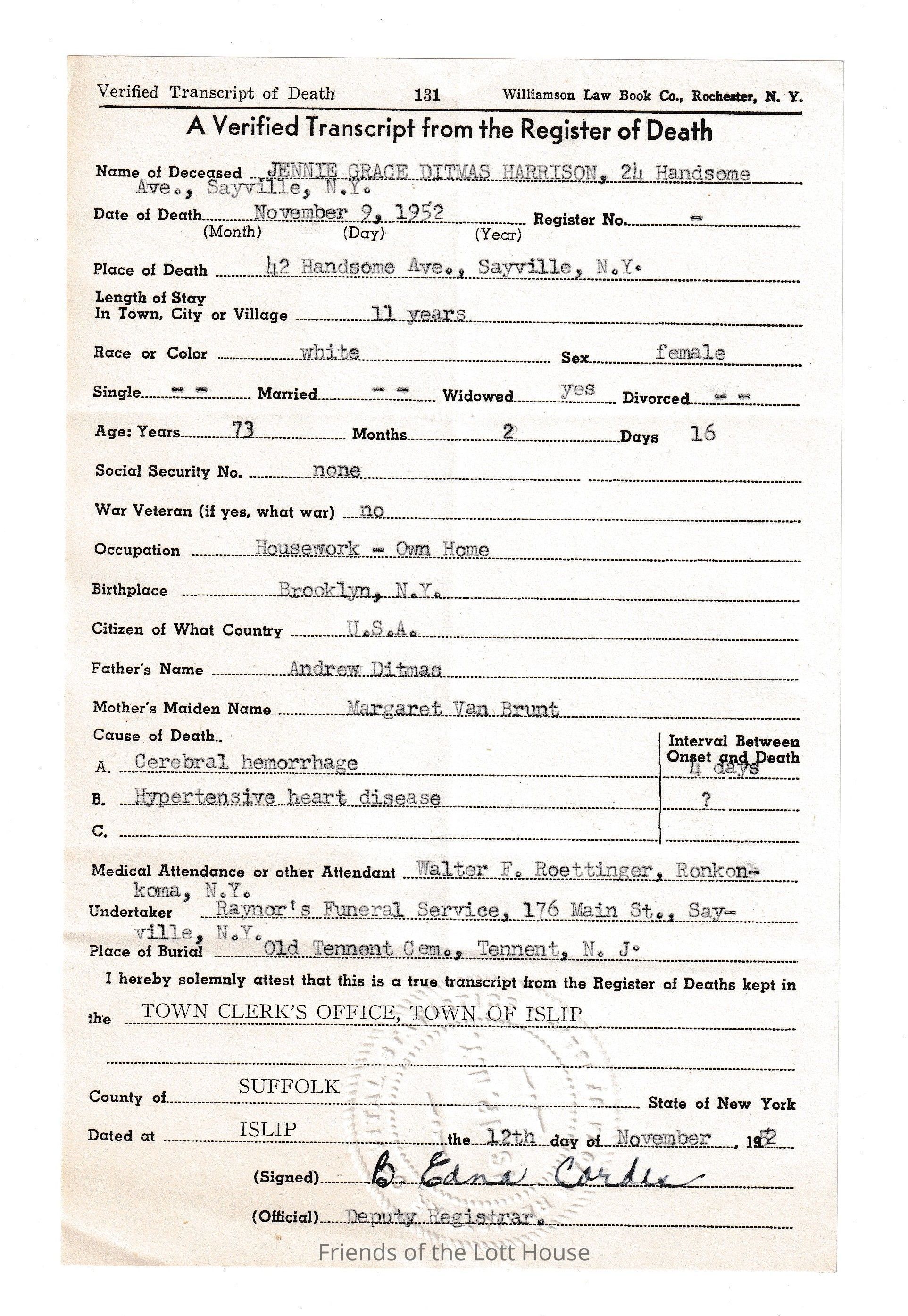 Death register for Jennie Grace Ditmas Harrison