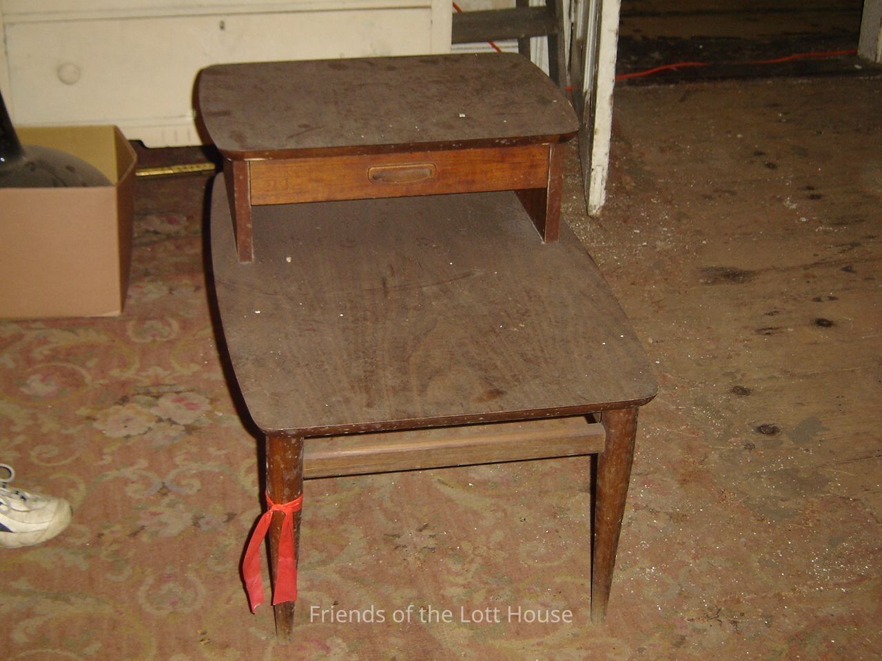 Wood end table of curved, rectangular shape having a partial second tier fitted with drawer, supported on turned, tapered legs.Acquisition
