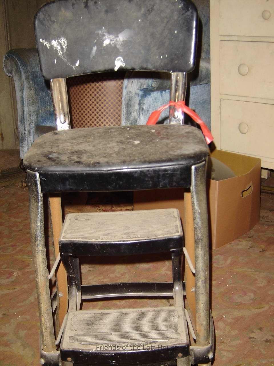 Metal chair having black metal back rest and seat fitted with fold-out steps with rubber runners. 'Metaloid' makers mark embossed in the rubberAcquisition