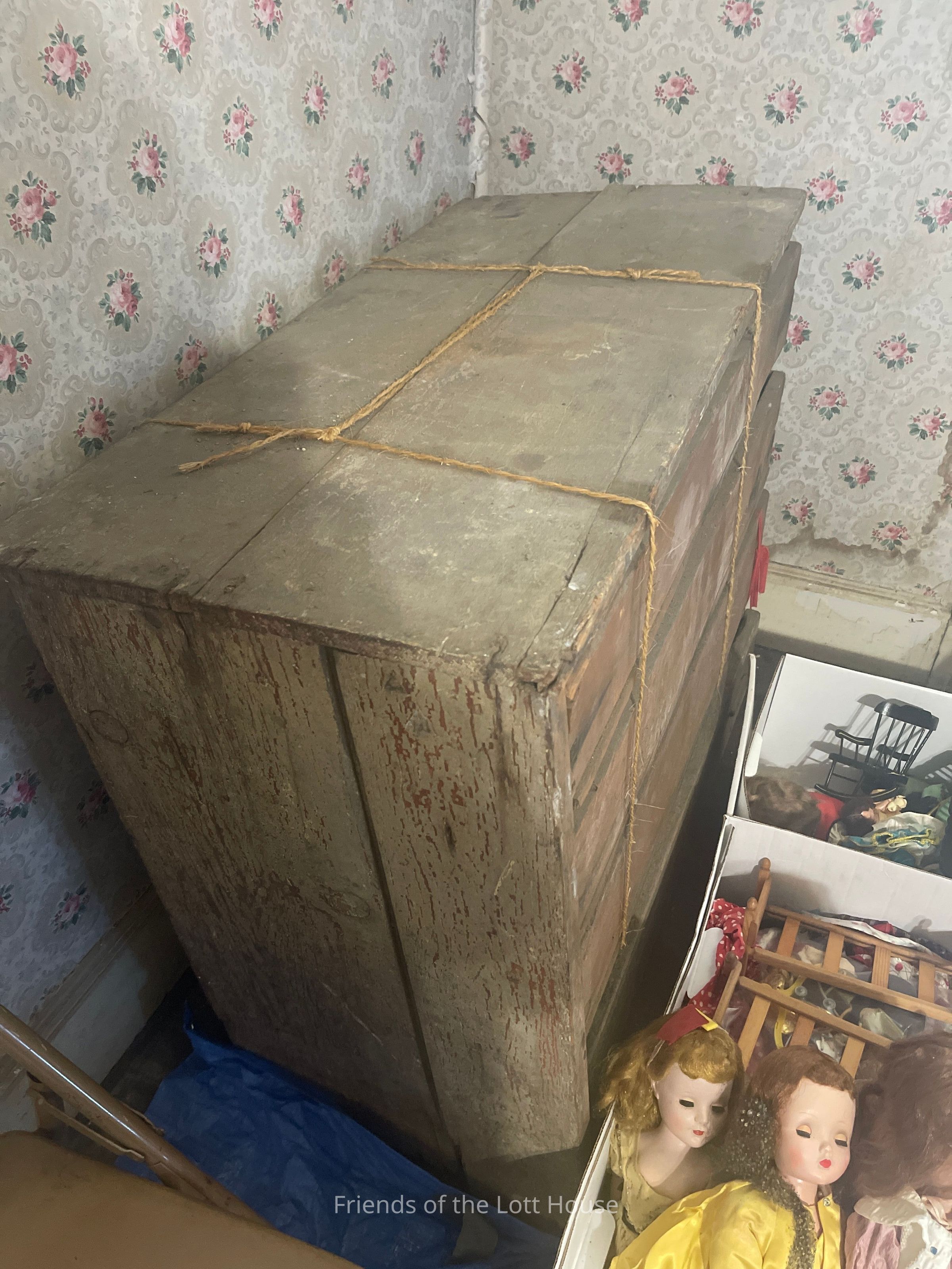 Wood dresser having four drawers, of plain in construction and ornamentation, remnants of paint, one of drawers in pieces, LH2005.025Acquisition