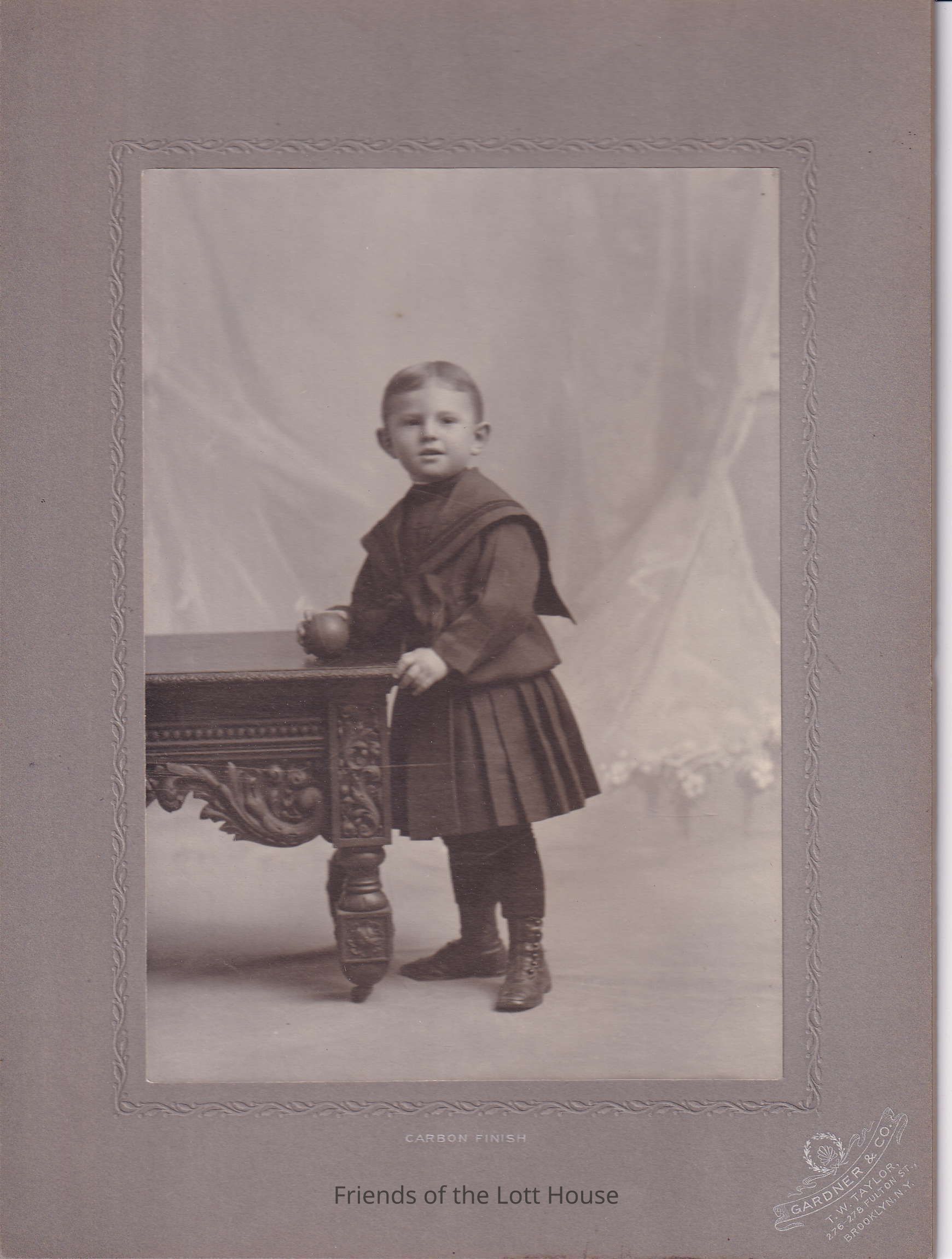 Photograph of a child standing next to a table with a ball in their hand.Collection