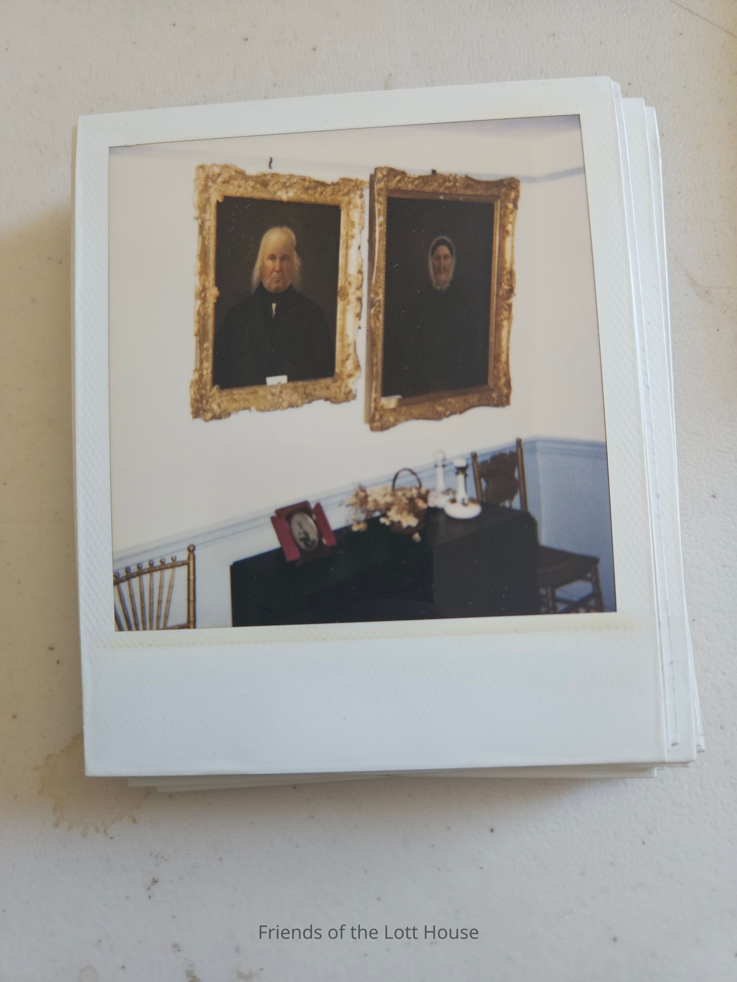 Photograph of a wall with two paintings hanging on it above a table covered in objectsCollection