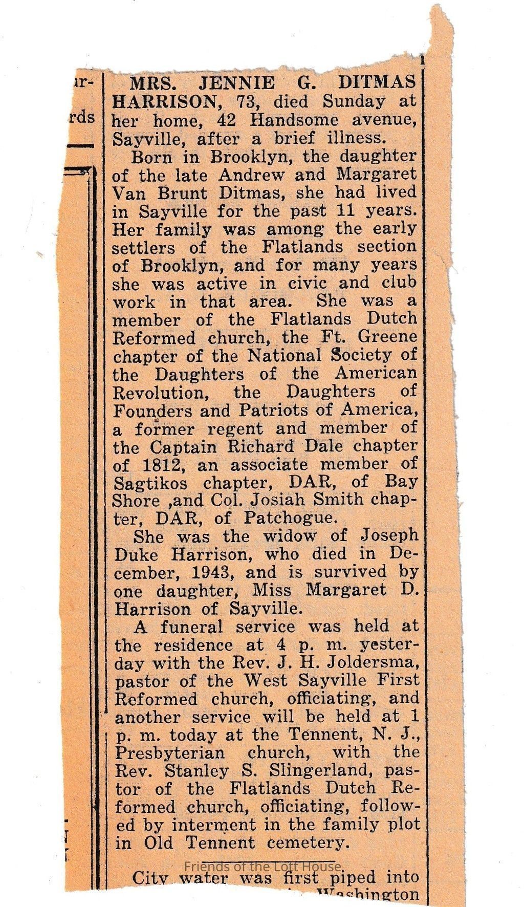 Newspaper clipping of the death of Mrs. Jennie G Ditmas