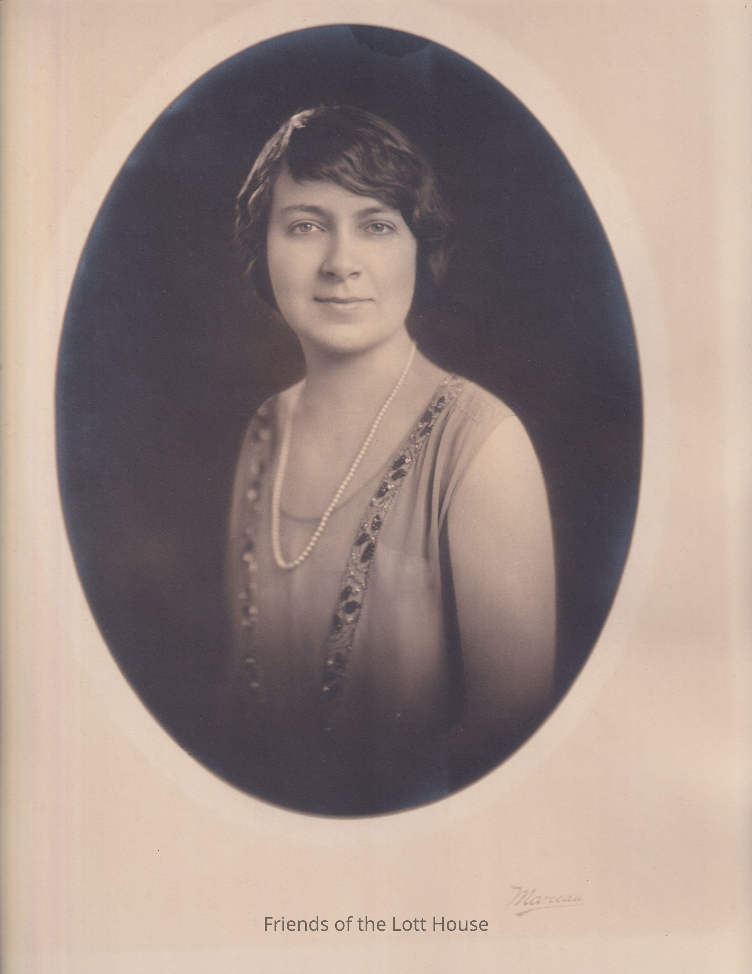 Headshot photograph of a young woman in a dress wearing pearls.Collection