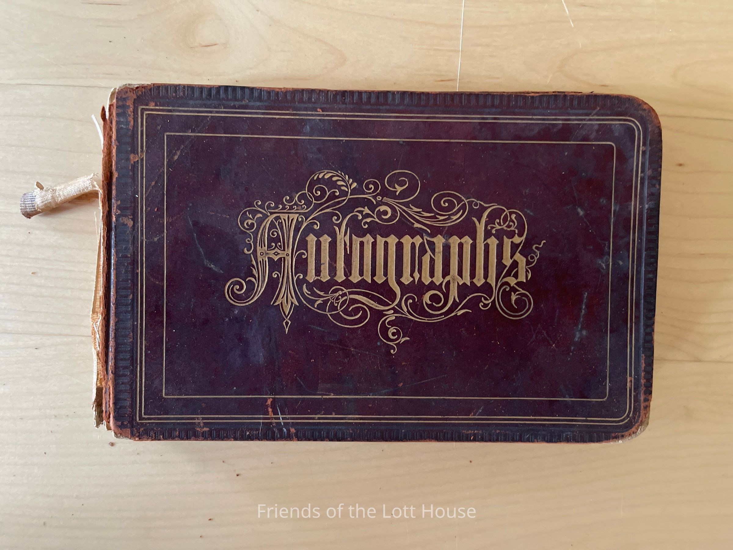 Small maroon book with "Autographs" printed on the cover. Writing insideCollection