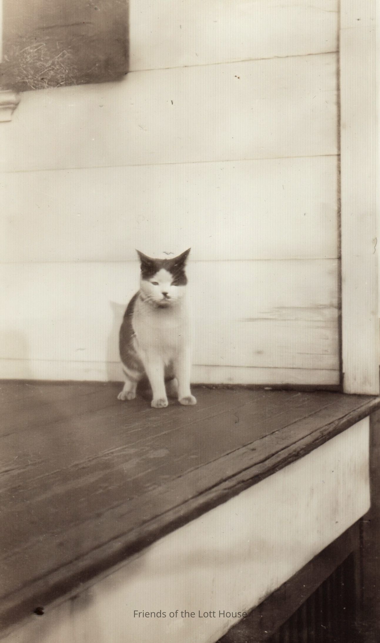 Cat sitting on the porch of the house looking at the camera.Photograph Details