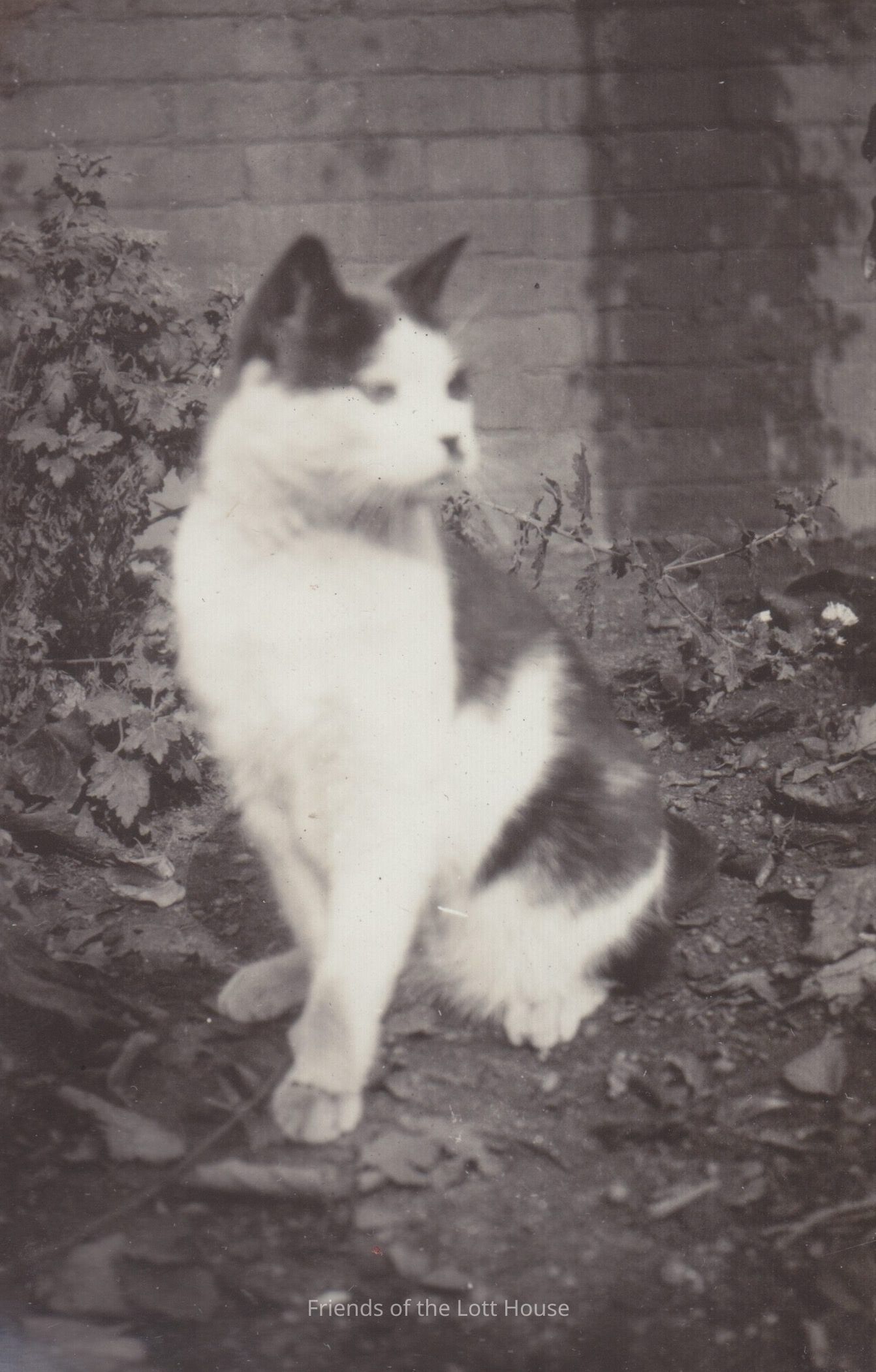 Closeup photograph of a cat with brick wall and vegetation in the background, looking off into the distance.Photograph Details