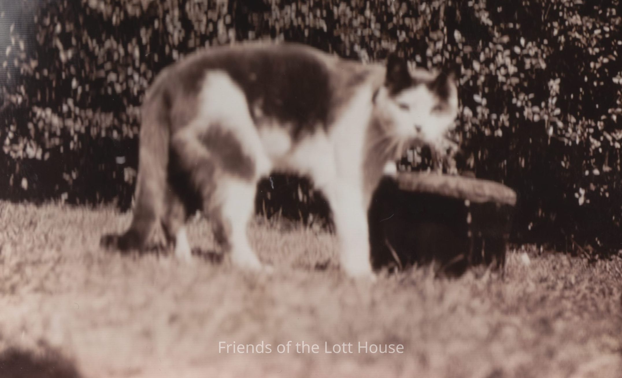 Cat standing up in the yard, looking in the direction of the camera. Bushes in the background.Photograph Details