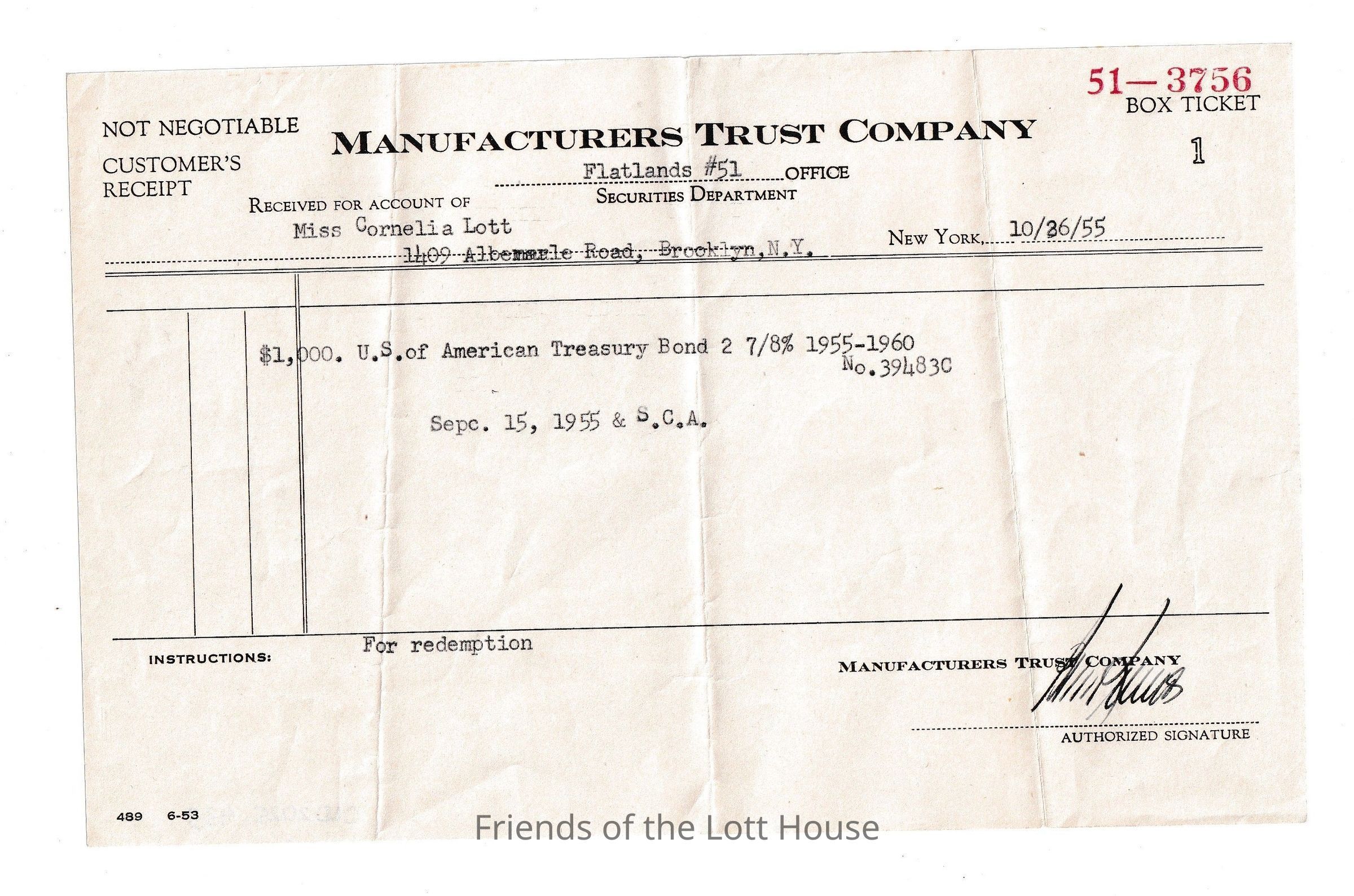 Manufacturers Trust Company $1,000 US of American Treasury bond 1955-1960 from Cornelia LottCollection