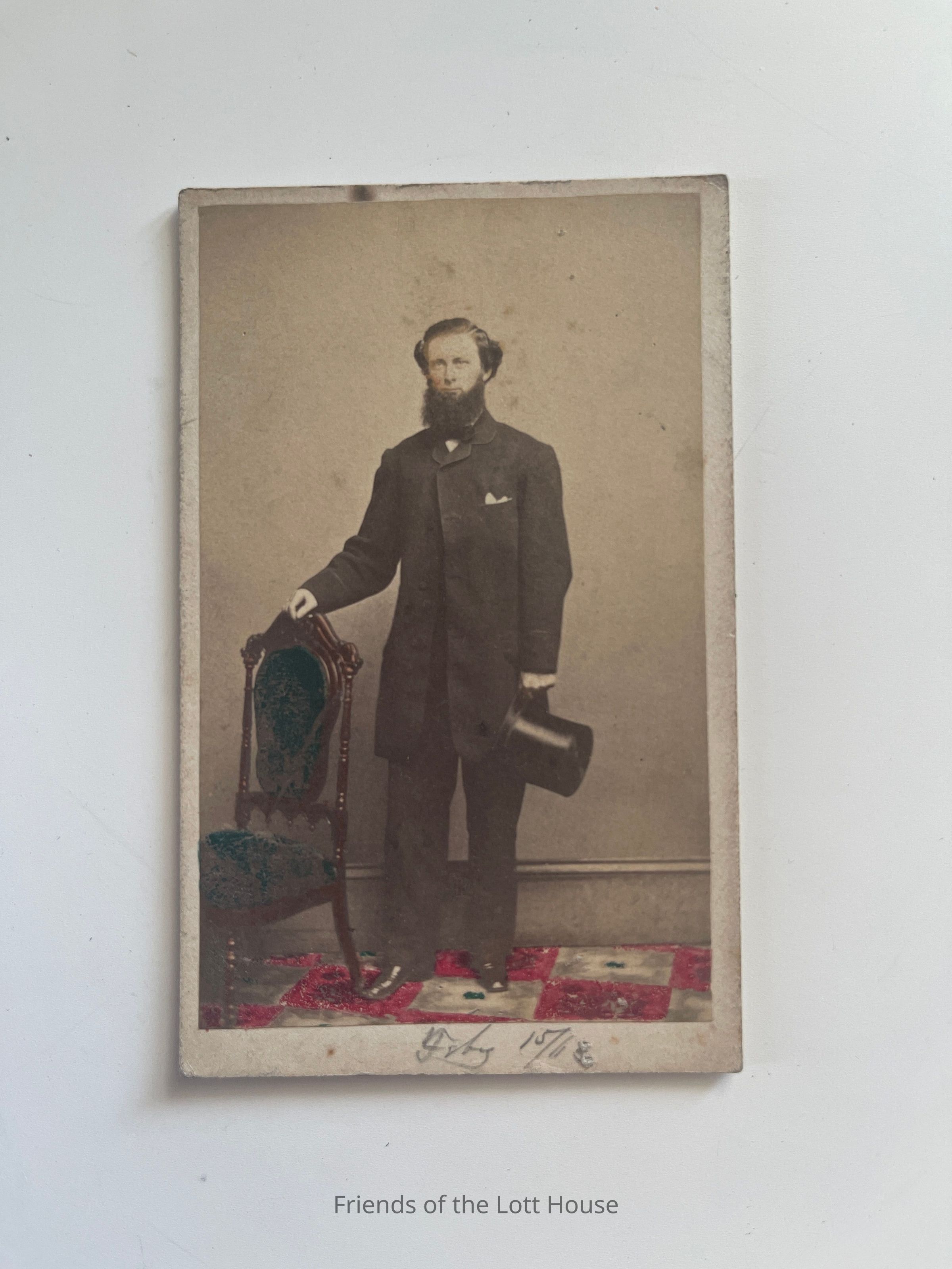 Photograph of man standing for professional photograph, next to chair and holding hatCollection