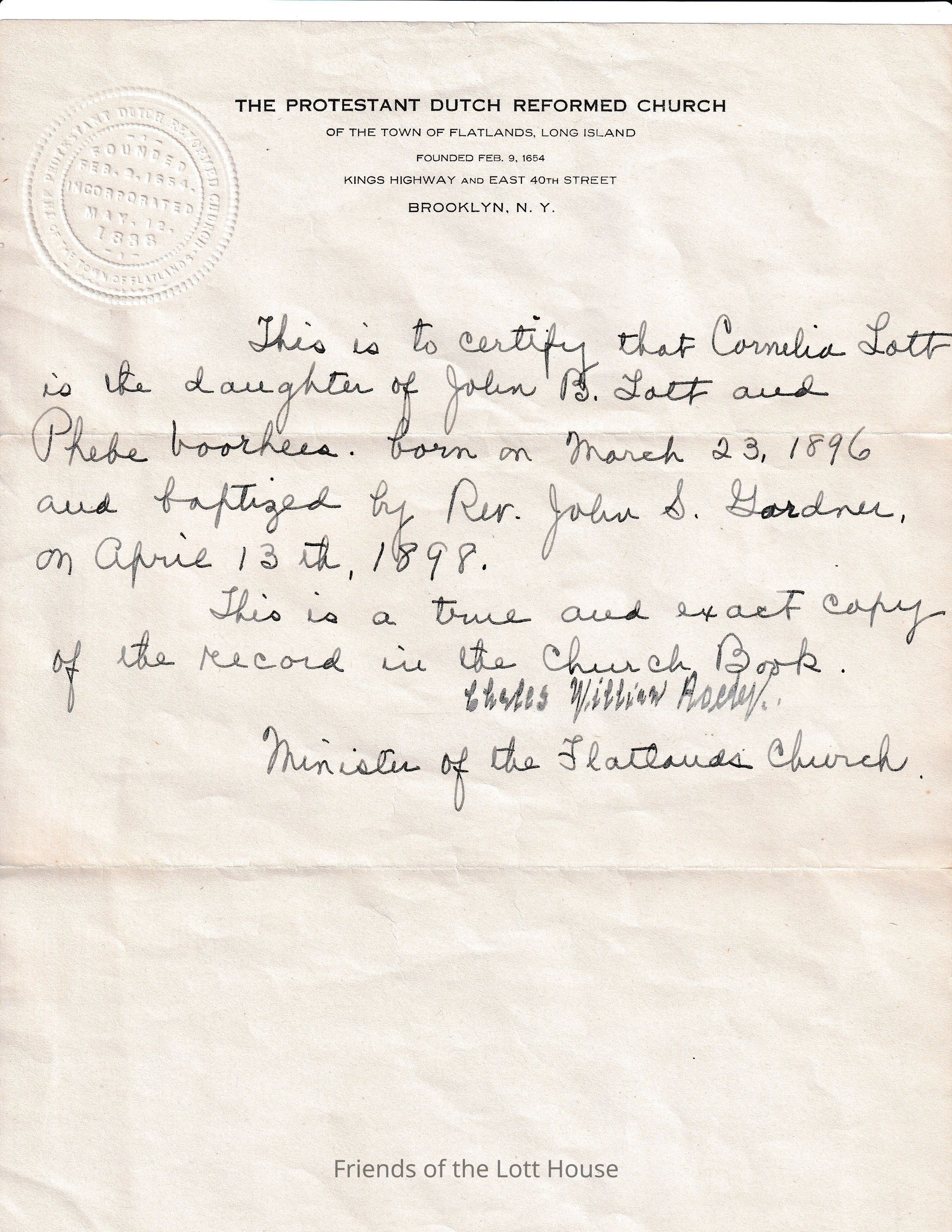 Certificate of baptism of Cornelia Lott, April 13, 1898Collection