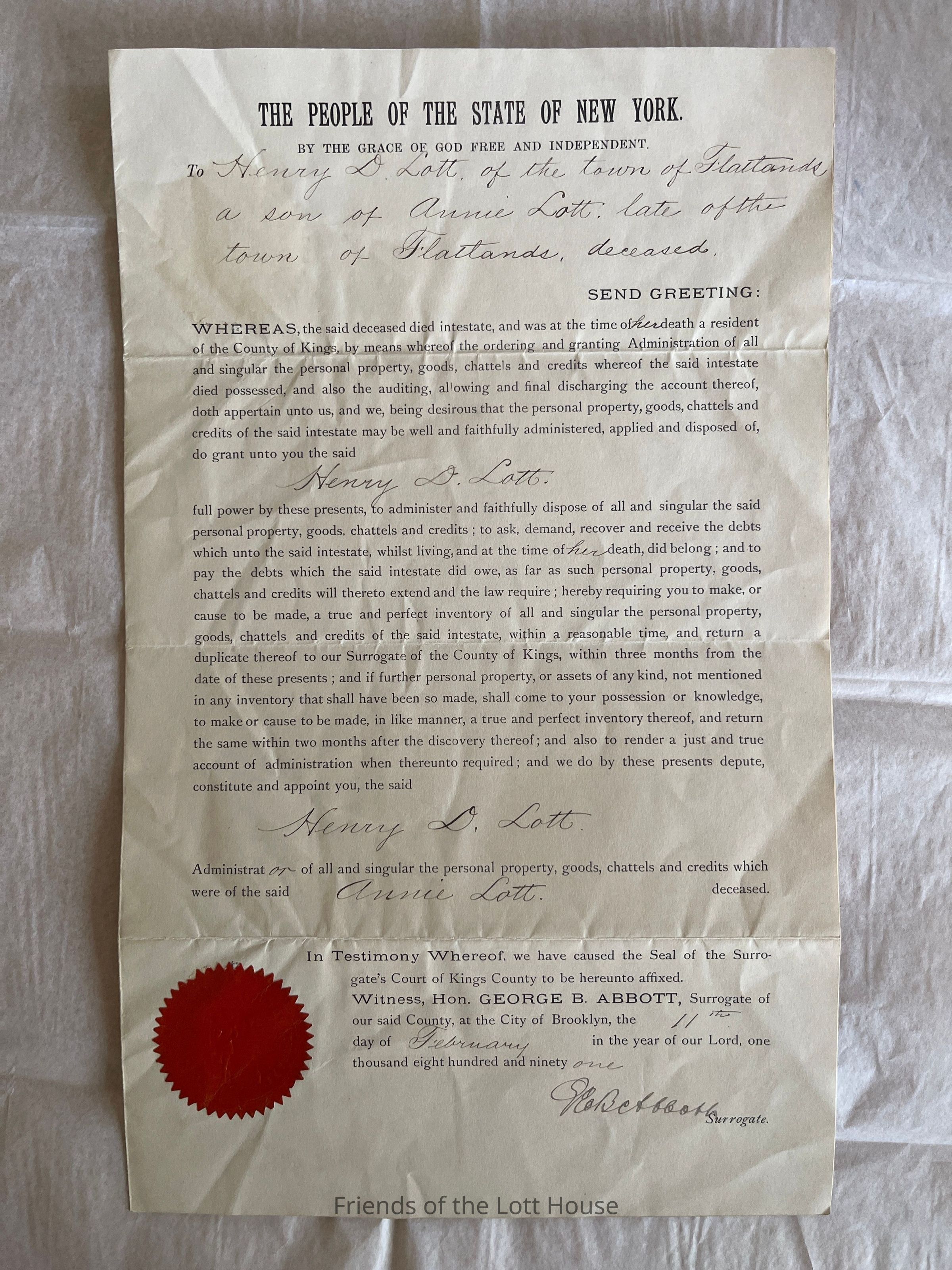 Letters of Administration, Notice of death Annie Lott February 11, 1891Collection