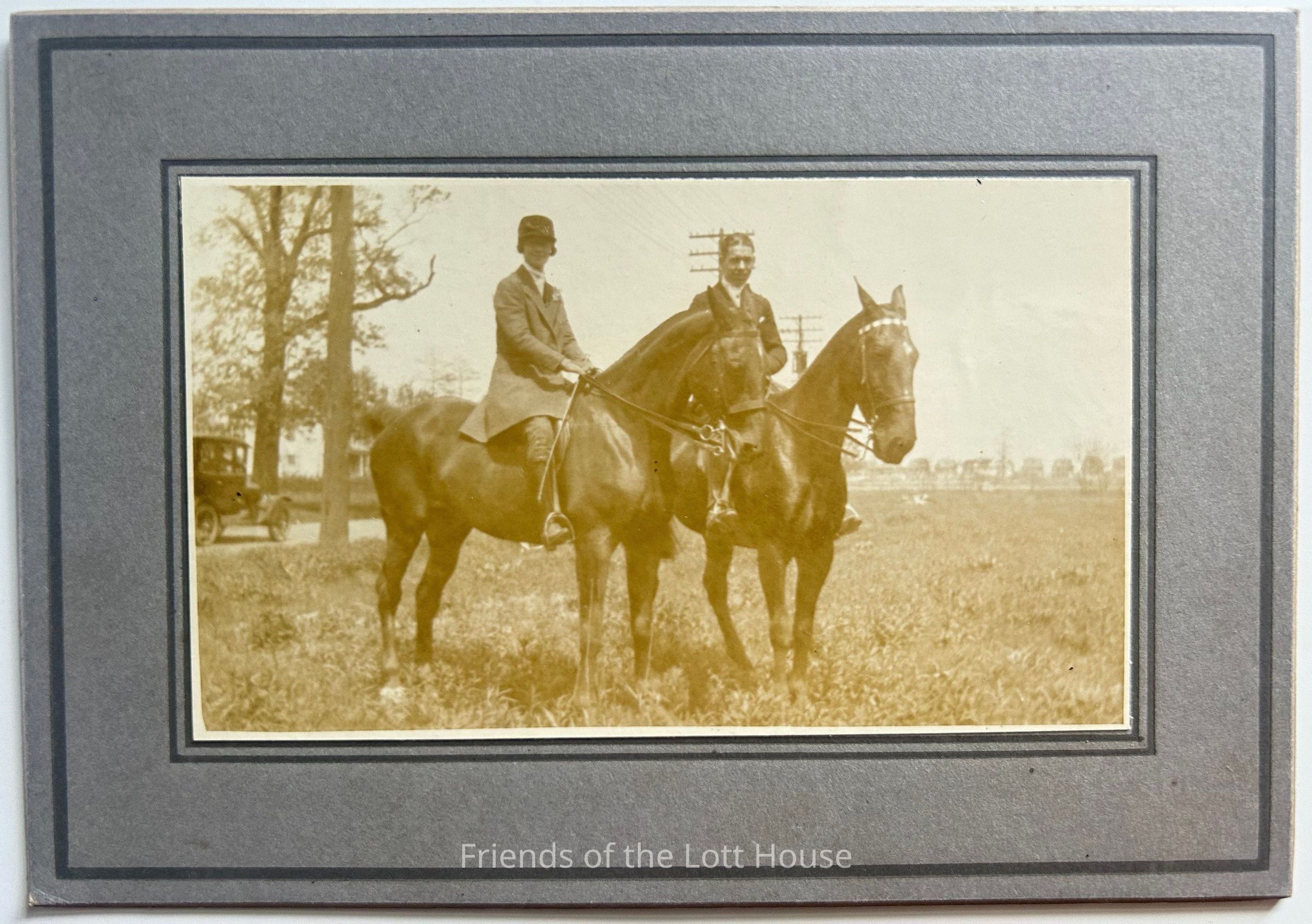 Photograph of a man and woman on horseback. Woman appears to be wearing riding gear.Collection