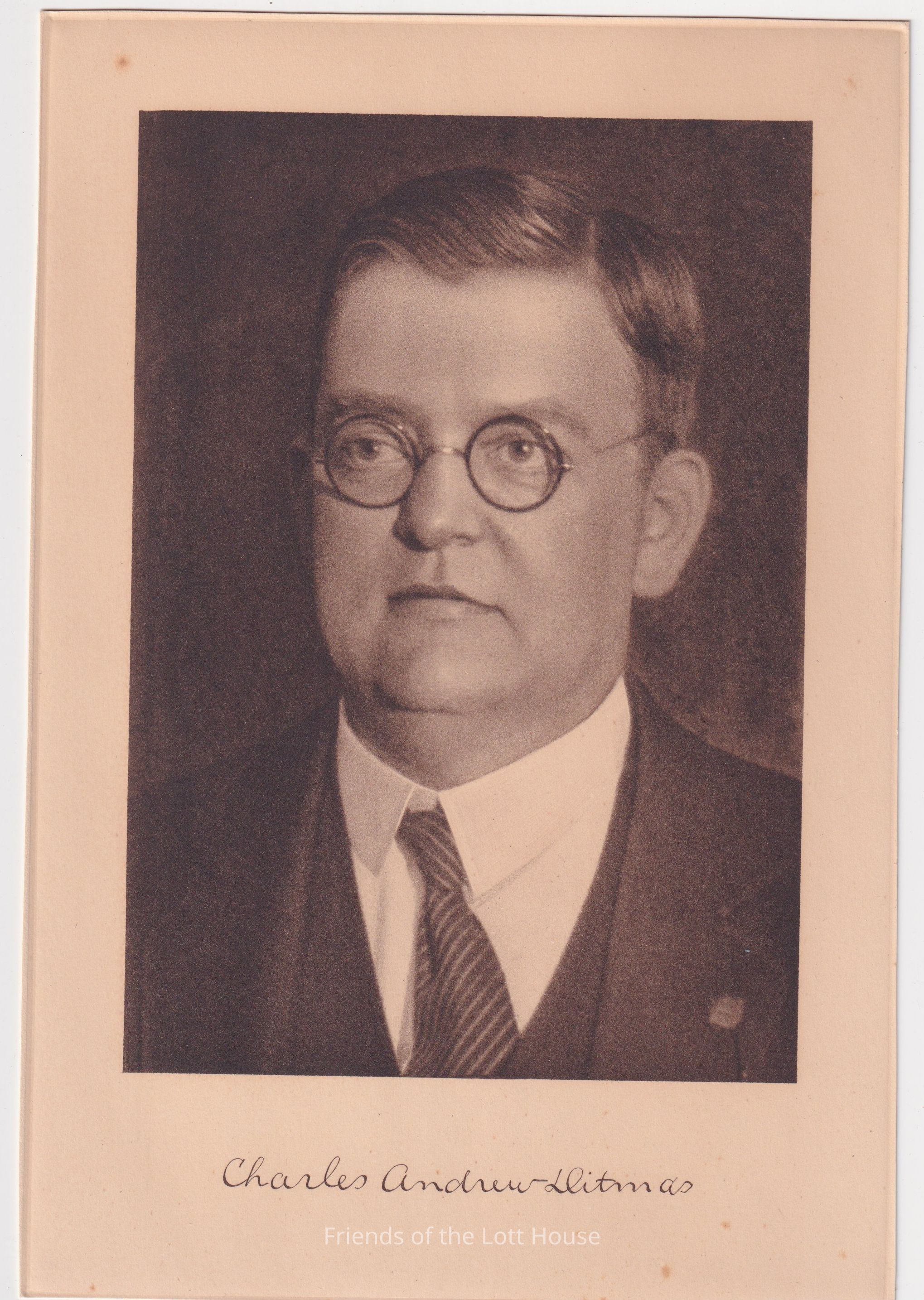 Rectangular photo of man (CAD) with round glasses, striped tie.Collection