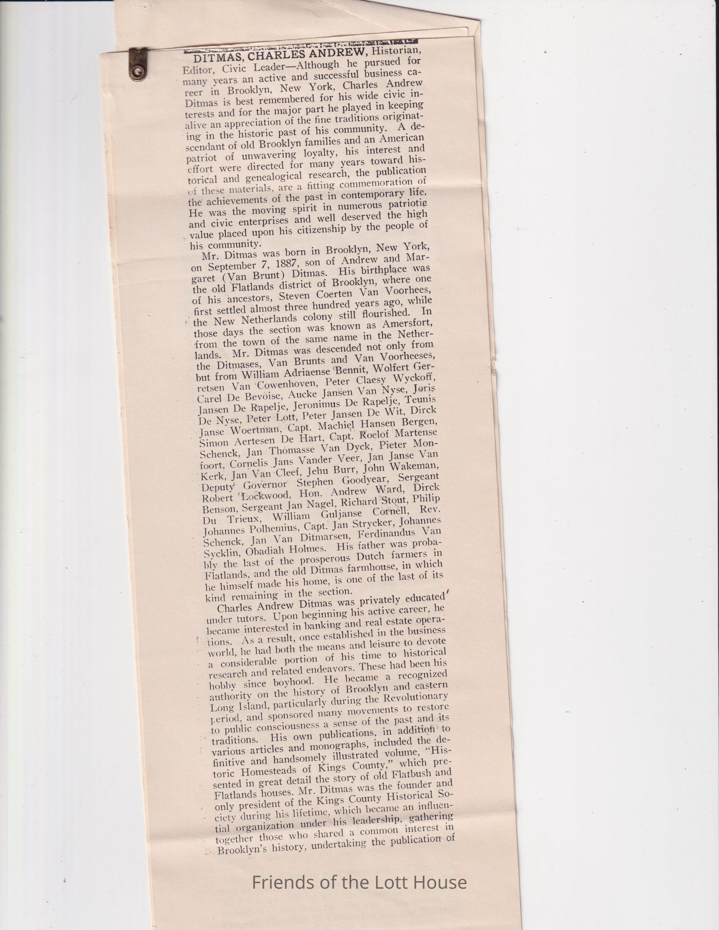 Ditmas, Charles Andrew, Historian, Editor, Civic Leader - Although he pursued for many years an active and successful business career in Brooklyn, New York, Charles Andrew Ditmas is best remembered for his wide civic interests and for the major part he played in keeping alive an appreciation of the fine traditions originating in the historic past of the community. A descendant of old Brooklyn families and an American patriot of unwavering loyalty, his interest and effort were directed for many years toward historical and geneological research, the publication of these materials, are a fitting commemoration of the achievements of the past in contemporary life. He was the moving spirit in numerous patriotic and civic enterprises and well deserved the high value placed upon his citizenship by the people of his community. Mr Ditmas was born in Brooklyn, New York, on September &, 1887, son of Andrew and Margaret (Van Brunt) Ditmas. His birthplace was the old Flatlands district of Brooklyn, where one of his ancestors, Steven Coerten Van Voorhees, first settled almost three hundred years ago, while the New Netherlands colony still flourished. In those days the section was known as Amersfort, from the town of the same name in the Netherlands. Mr. Ditmas was descended not only from the Ditamases, Van Brunts and Van Voorheeses, but from Wiliam Adriaense Bennit, Wolfert Gerretsen Van Cowenhoven, Peter Claesy Wyckoff, Carel De Bevoise, Aucke Jansen Van Nyse, Joris Jansen De Rapelje, Jeronimus De Rapelje, Teunis De Nyse, Peter Lott, Peter Jansen De Wit, Dirck Janse Woertman, Capt. Machiel Hansen Bergen, Simon Aertensen De Hart, Capt. Roelof Martense Schenck, Kan Thomasse Van Dyck, Jan Janse Van Kerk, Jan Van Cleef, Jehu Burr, John Wakeman, Deputy Governor Stephen Goodyear, Sergeant Robert Lockwood, Hon. Andrew Ward. Dirck Benson, Sergeant Jan Nagel, Richard Stout, Philip Du Trieux, William Guljanse Cornell, Rev. Johannes Polhemius, Capt. Jan Strycker, Johannes Schenck, Jan Van Ditmarsen, Ferdinandus Van Sycklin, Obadiah Holmes. His father was probably the last of the prosperous Dutch farmers in the Flatlands, and the old Ditmas farmhouse, in which he himself made his home, is one of the last of its kind remaining in the section. Charles Andrew Ditmas was privately educated under tutors. Upon beginning his active career, he became interested in banking and real estate operations. As a result, once established in the business world, he had both the means and leisure to devote a considerable portion of his time to historical research and related endeavors. These had been his hobby since boyhood. He became a recognized authority on the history of Brooklyn and eastern Long Island, particularly during the Revolutionary period, and sponsored many movements to restore to public consciousness a sense of the past and its traditions. His own publications, in addition to various articles and monographs, included the definitive and handsomely illustrated volume, "Historic Homesteads of Kings County,' which presented in great detail the story of old Flatbush and Flatlands houses. Mr. Ditmas was the founder and only president of the Kings County Historical Society during his lifetime, which became an influential organization under his leadership, gathering together those who shard a common interest in Brooklyn's history, undertaking the publication of