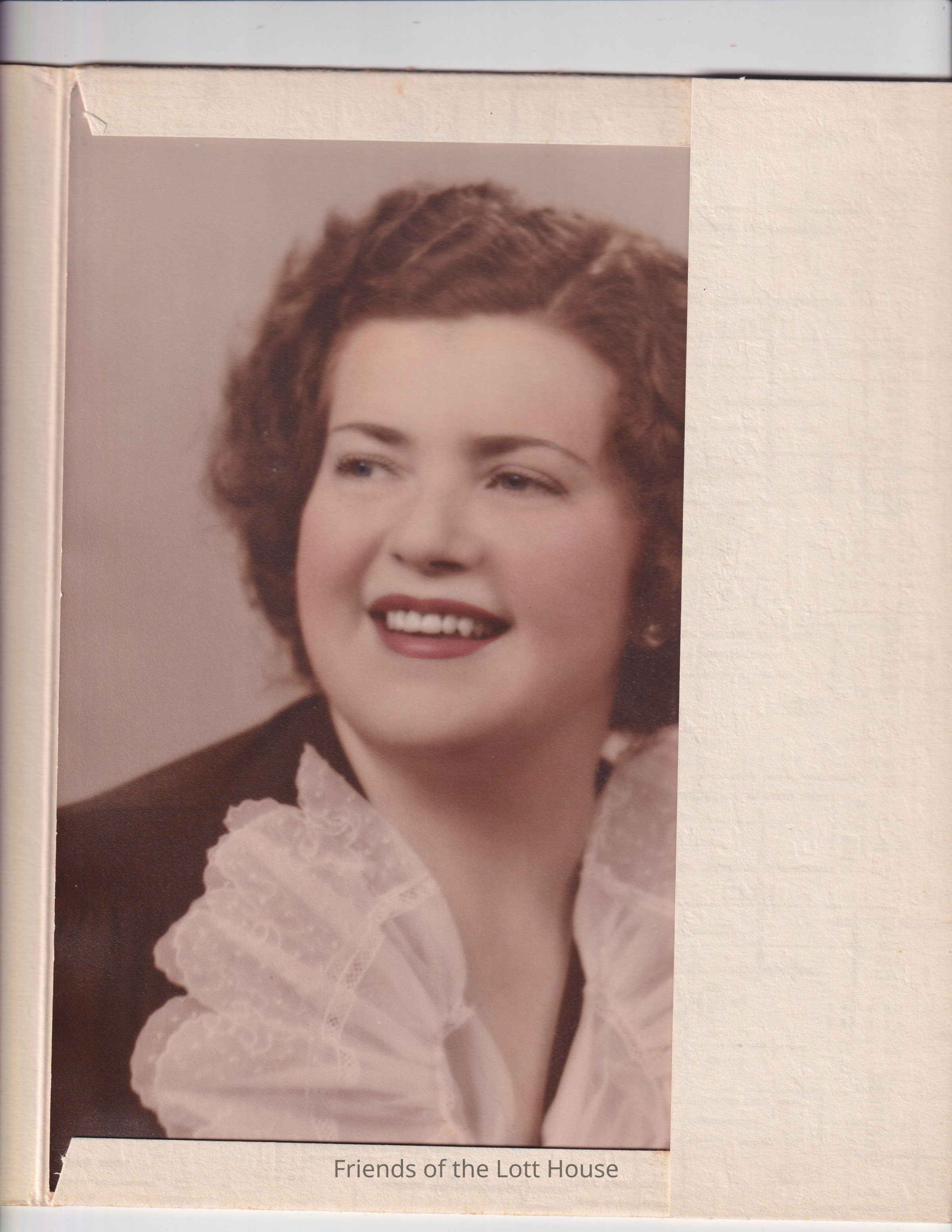 Tan folder including colorized photo of MDH2004 (Margaret D Harrison facing the camera and smiling to her right.)Collection