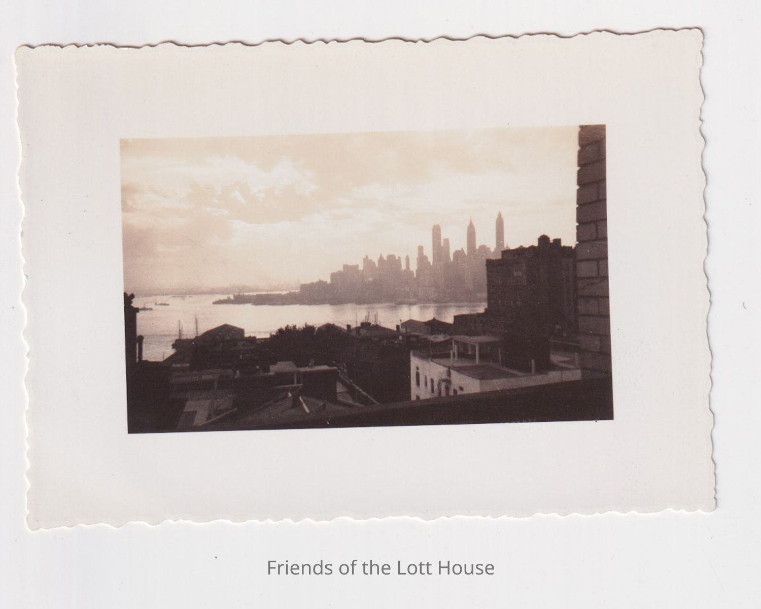 New York skyline seen in distance from rooftops, body of water in bkg. Brick building on right side.Collection