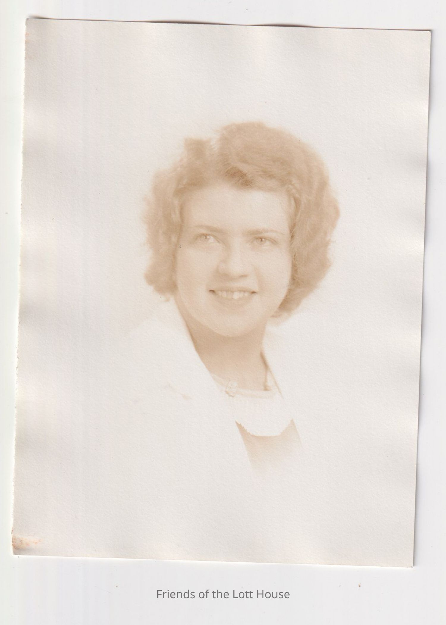 Margaret D Harrison wearing a white collar and jacket and smiling to left of camera.Collection