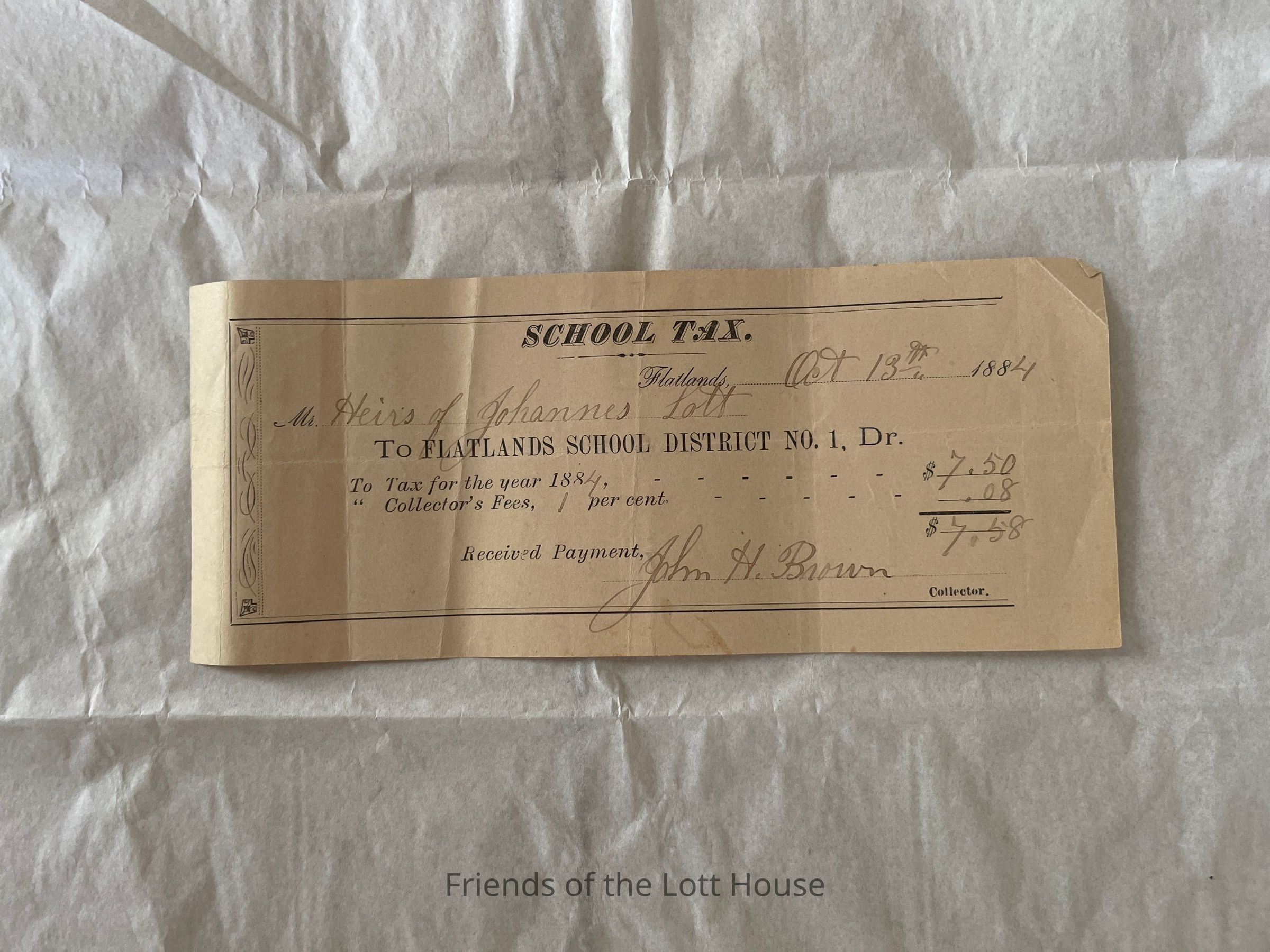 School Tax Receipt to heirs of Johanis Lott October 13, 1884