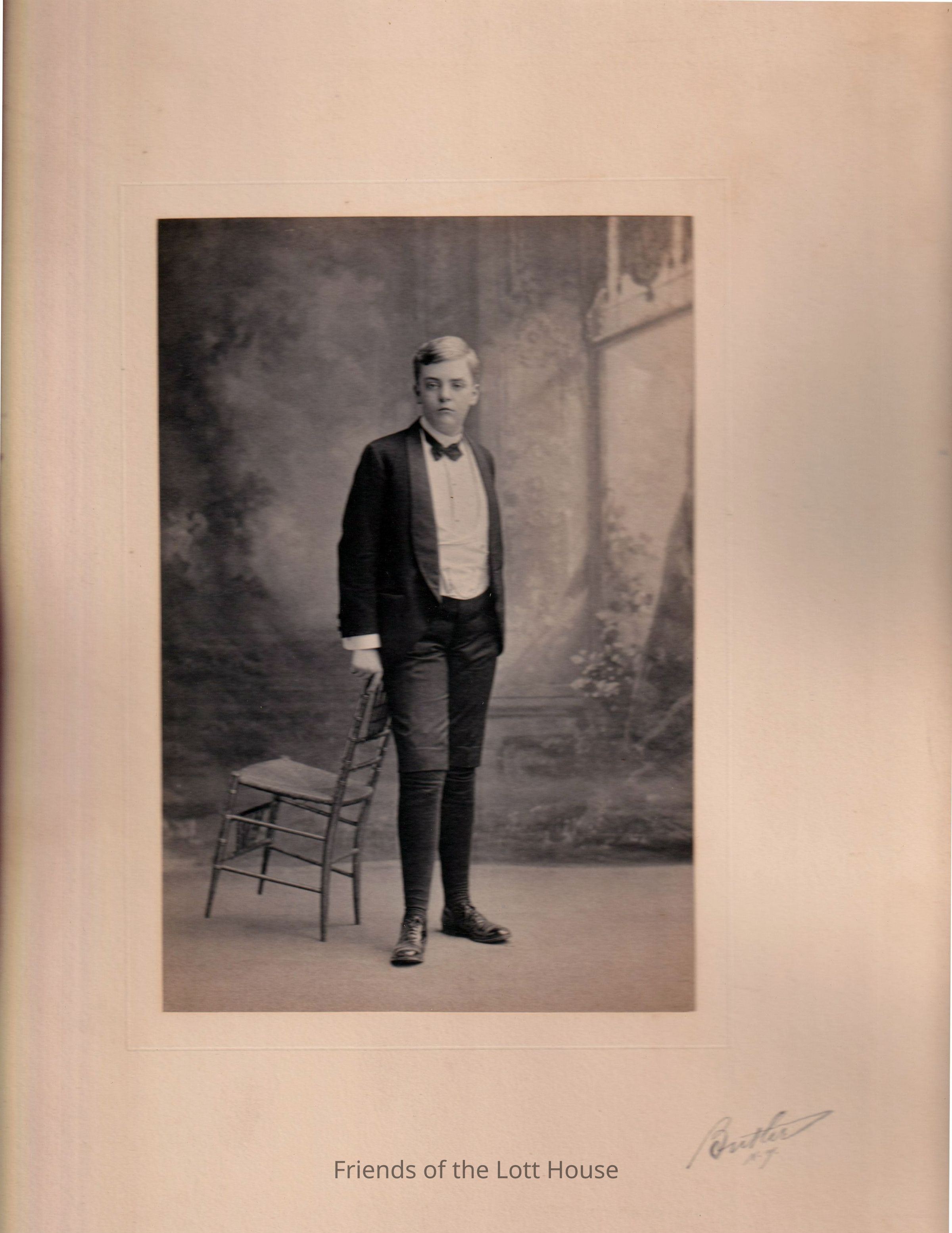 Posed photograph of a young man in formal wear leaning on a chair. Charles A. DitmasCollection