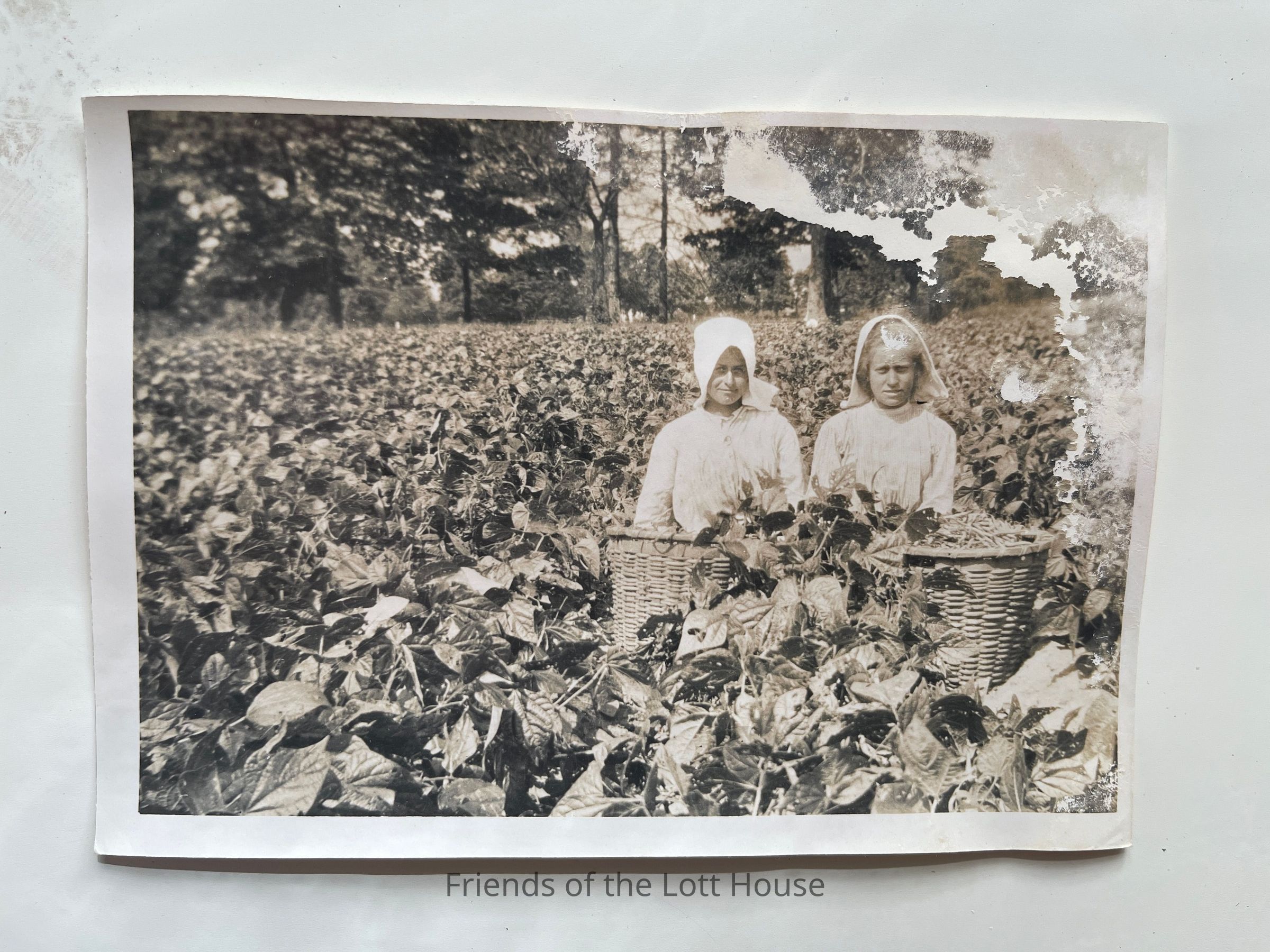 two girls picking cabbage on Lott farm with baskets.