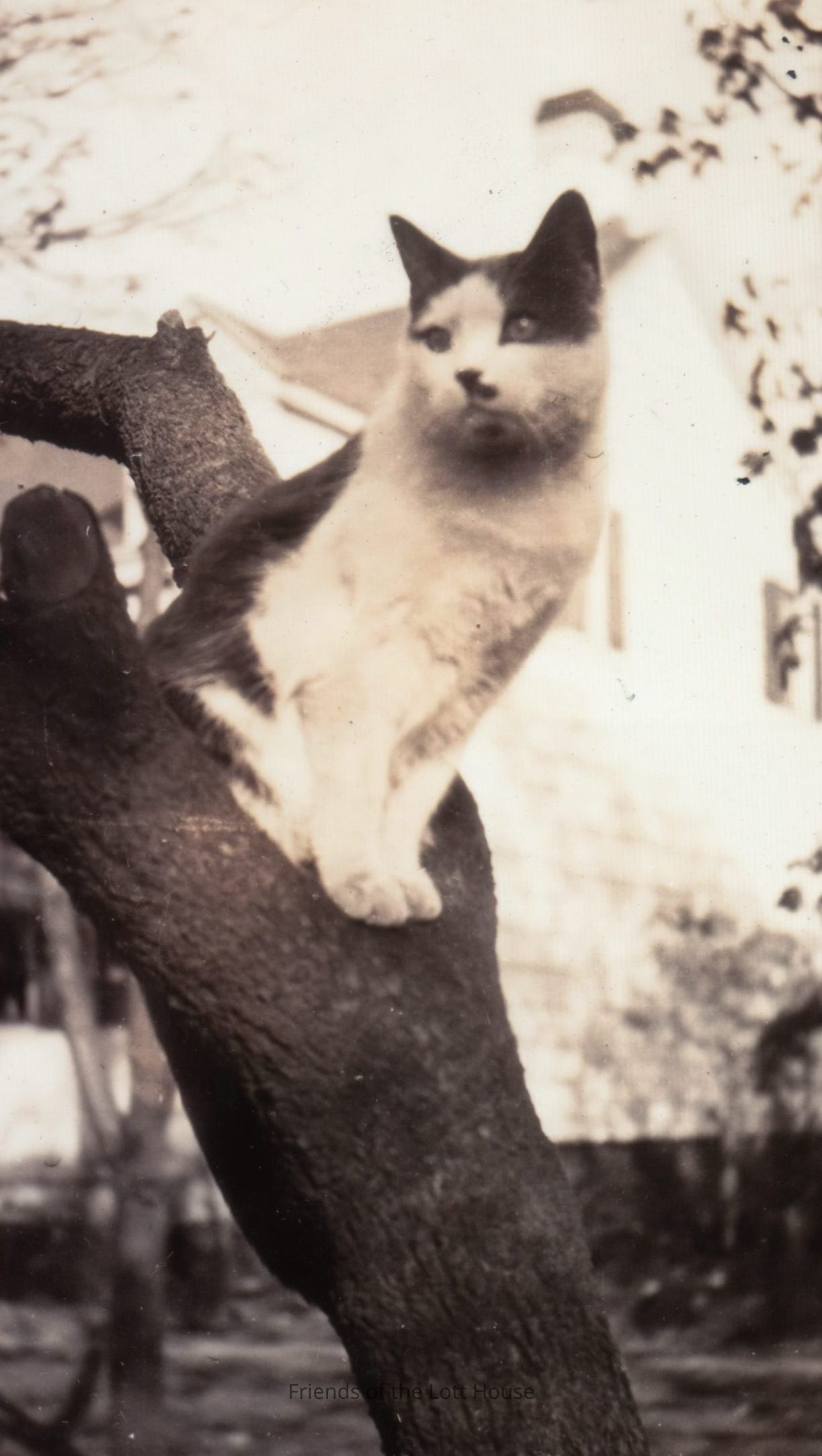 Closeup photograph of a cat sitting in the crook of a tree, leaning forward, and looking into the distance. House in the background.Photograph Details