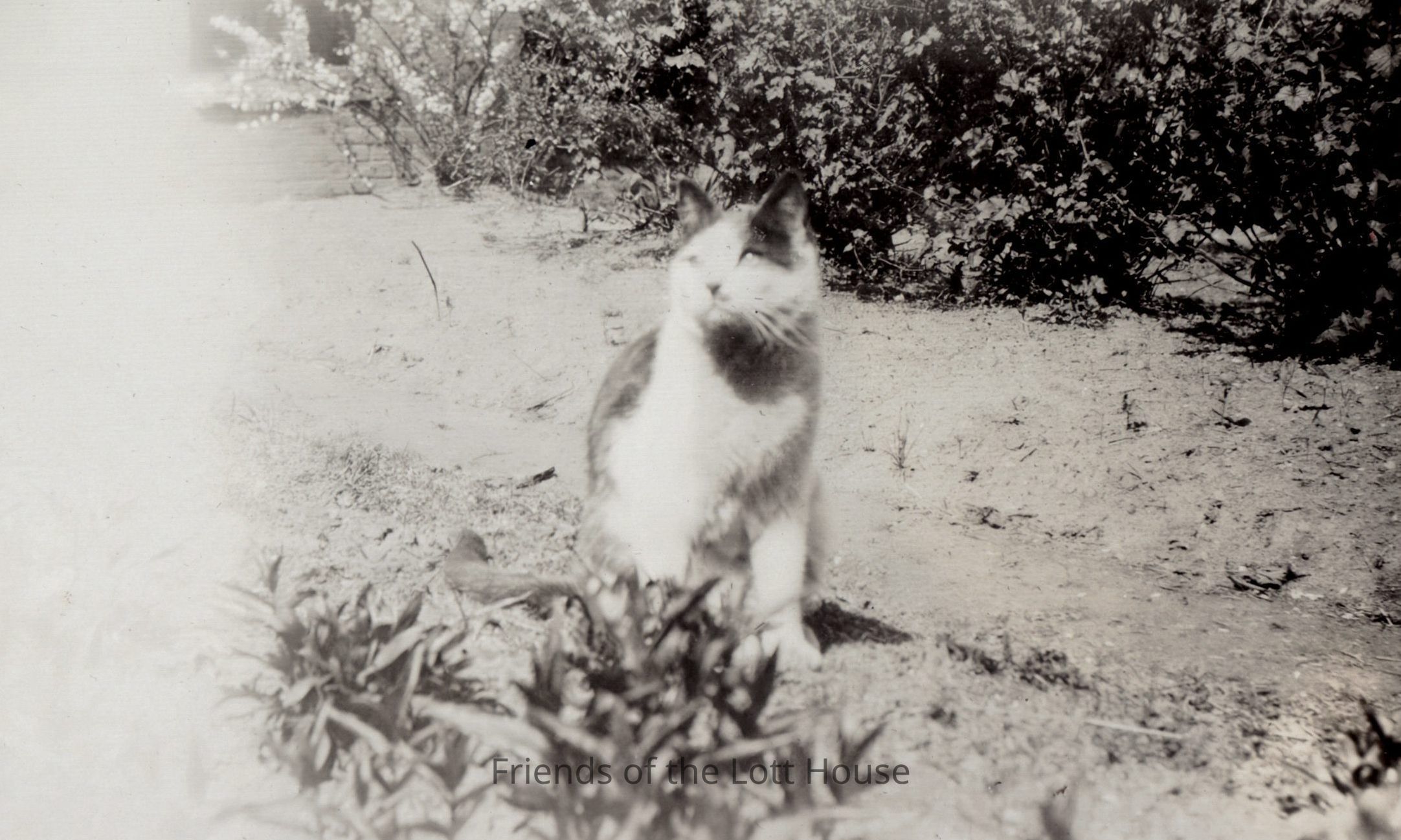Photograph of cat looking into the distance. Bushes in the background.Photograph Details