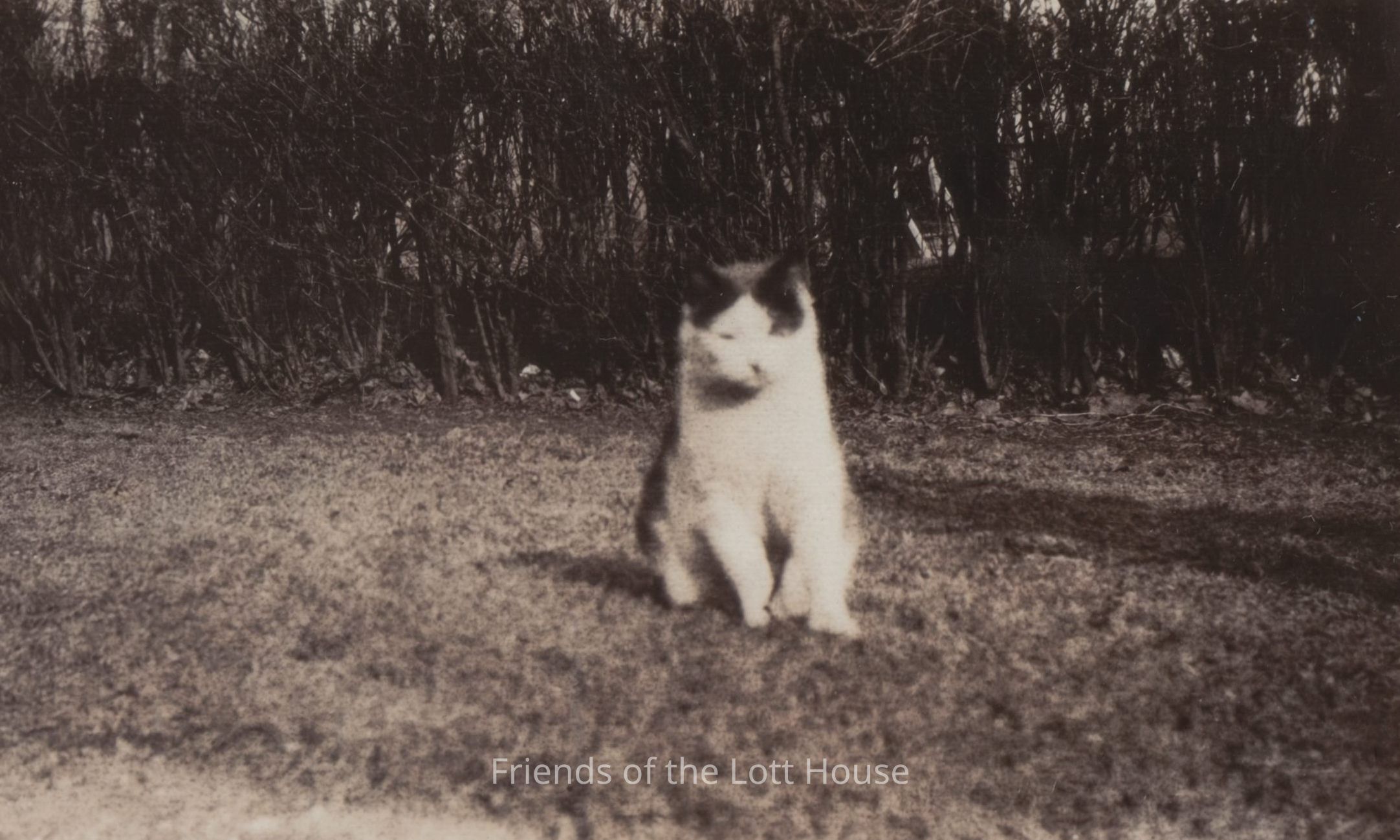 Cat sitting on the ground, looking in the direction of the camera. Bushes in the background.Photograph Details