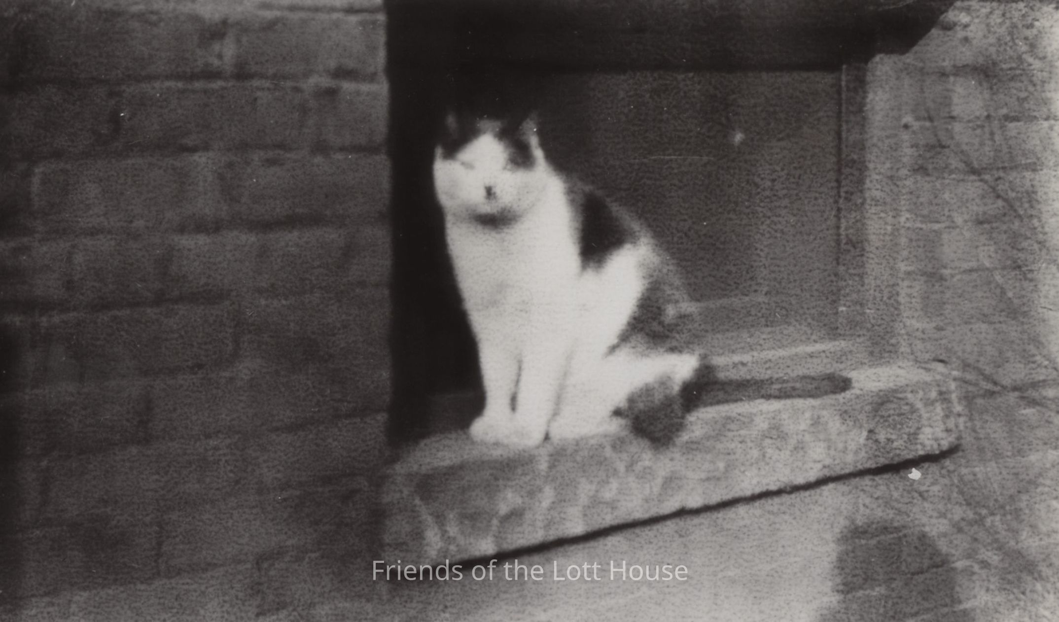 Cat looking into the camera, sitting on the exterior windowsill of a house.Photograph Details