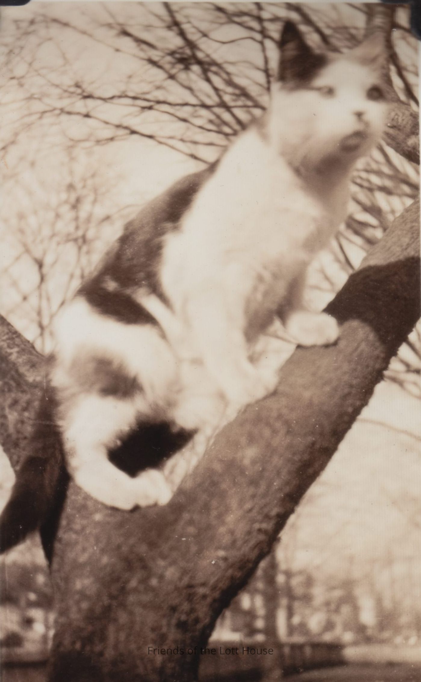 Cat standing on tree branch, intent on something behind the camera, in the distance.Photograph Details